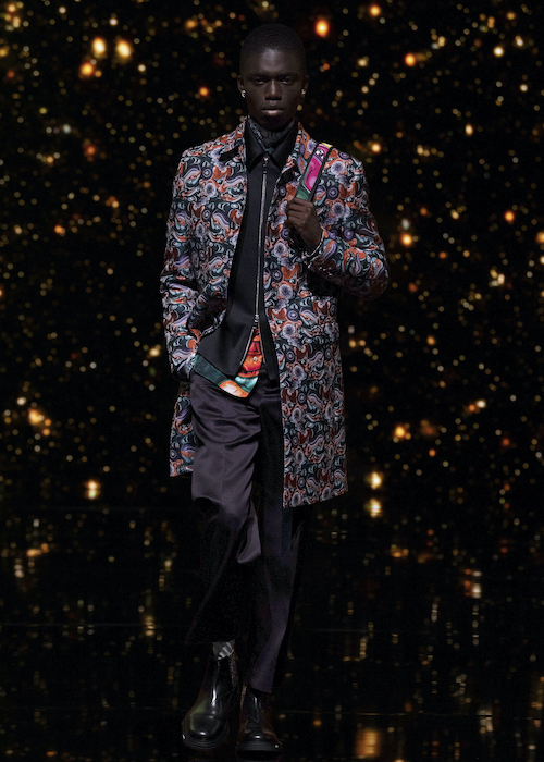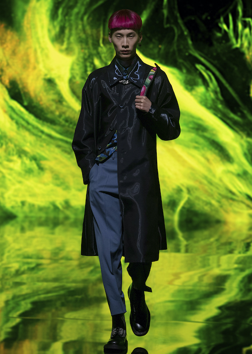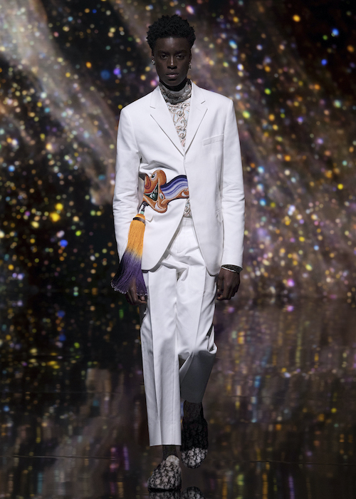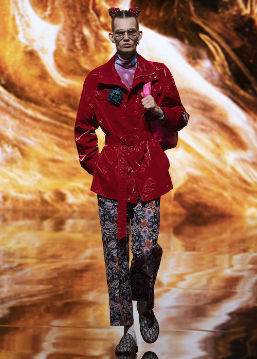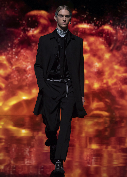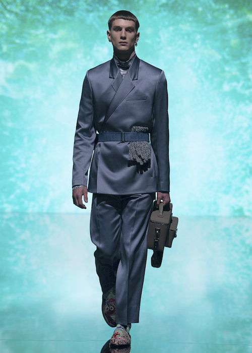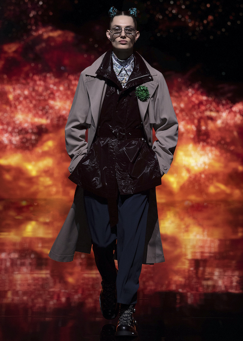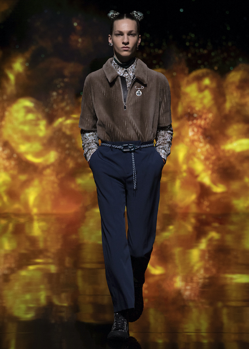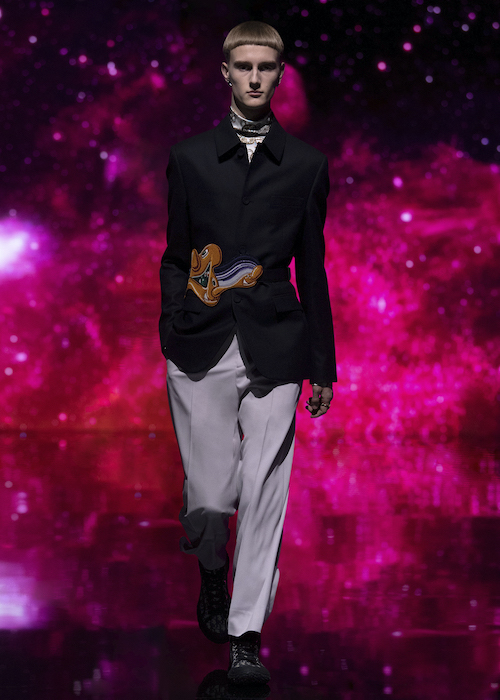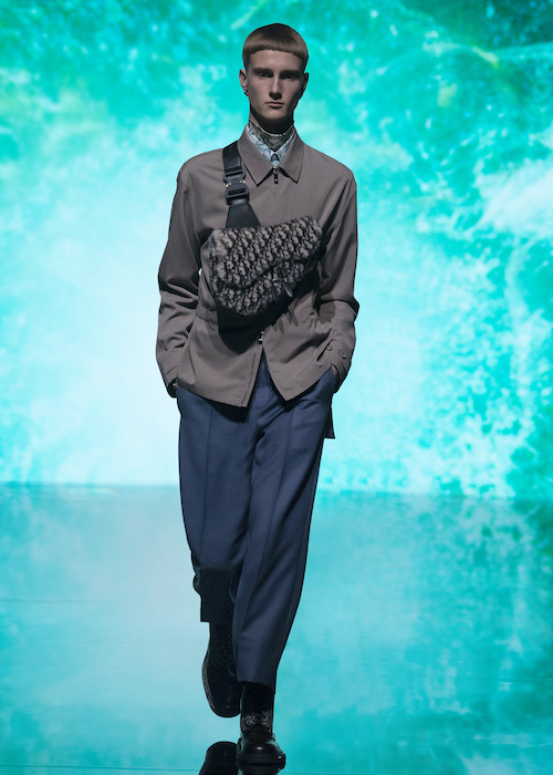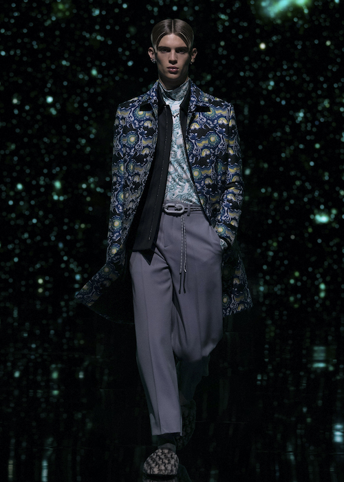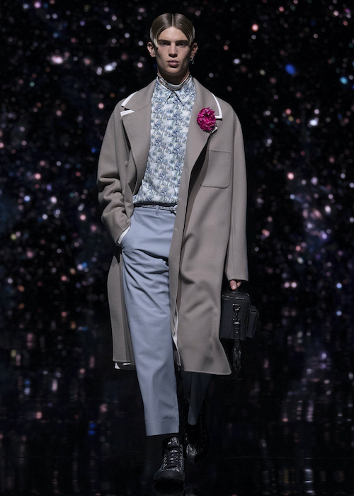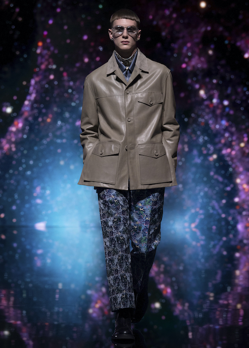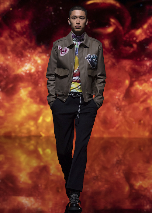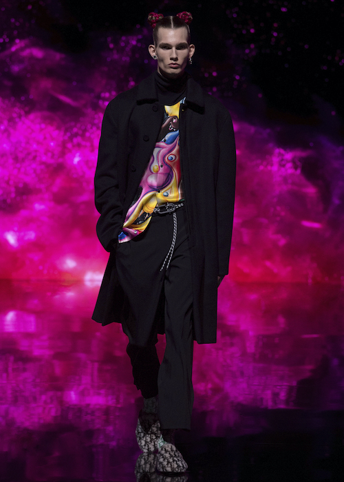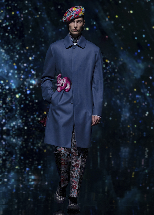 Новую коллекцию Ким Джонс готовил в соавторстве с художником Кенни Шарфом — представителем нью-йоркской арт-сцены 1980-х, который творит на стыке живописи, скульптуры и стрит-арта. К своим работам он применяет термин поп-сюрреализм: на них мультяшные герои попадают в сай-фай-декорации. Эти же сюжеты стали основой для большинства вещей Dior: свитеров с вышивкой, рубашек с принтами, пальто с набивным рисунком, мягких туфель, которые напоминают тапочки, а также сумок Saddle и беретов. Также в коллекции есть комплекты из вельвета, переливающиеся, как ртуть, плащи, костюмы с акцентом на талии. Над оформлением виртуального показа работал художник и режиссер Томас Ванц: космические фоны менялись на протяжении всего шоу.