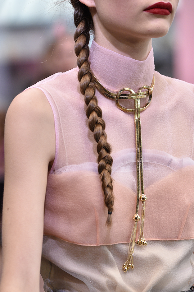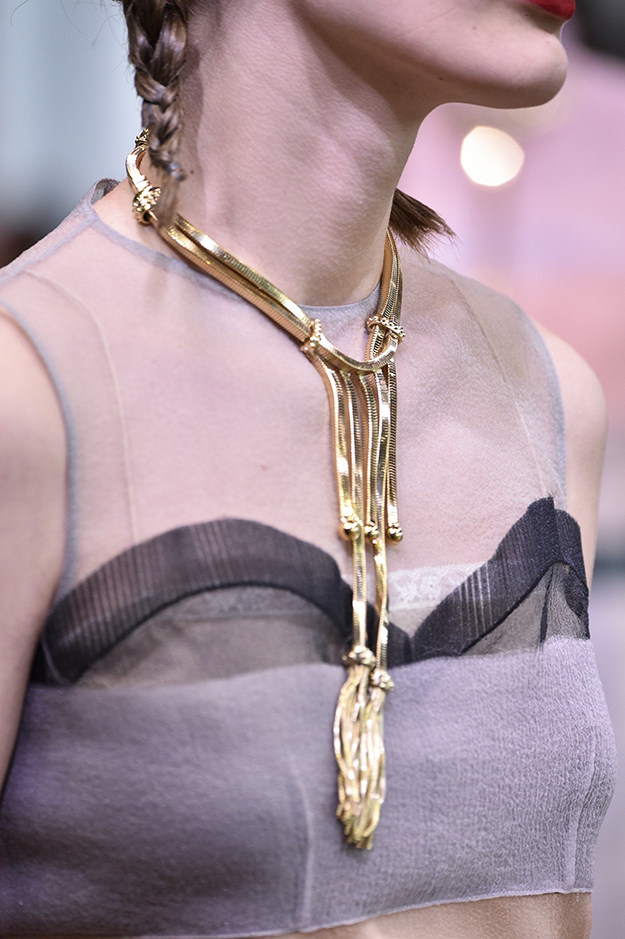 Основные элементы: платья-рубашки, вещи и вставки из прозрачной органзы, перья, пальто с голыми плечами, рукава-фонарики, плиссировка, цветочные принты, вышивка стеклярусом, блеск металла.