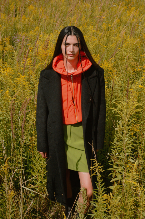 Московский бренд выпускает в хорошем смысле понятную одежду для города. Самая интересная категория Studio 29 — верхняя одежда. В осенней коллекции есть фактурные пальто в клетку, объемные парки и стеганые куртки — особенно круто выглядит вариант в голубую и белую полоску, который напоминает пижаму. Еще есть двухцветные костюмы с брюками карго из искусственной кожи и вязаный трикотаж в бодрящих оттенках бирюзы, лайма и мандарина. Также бренд представил свою первую сумку — вместительную модель из плащевой ткани, которую носят через плечо.