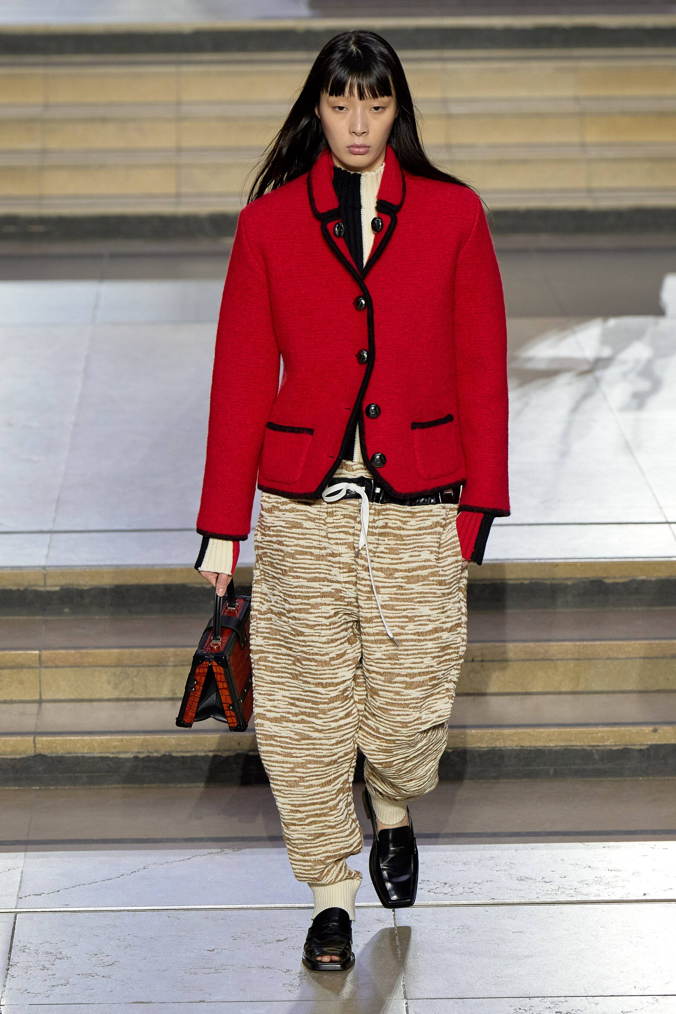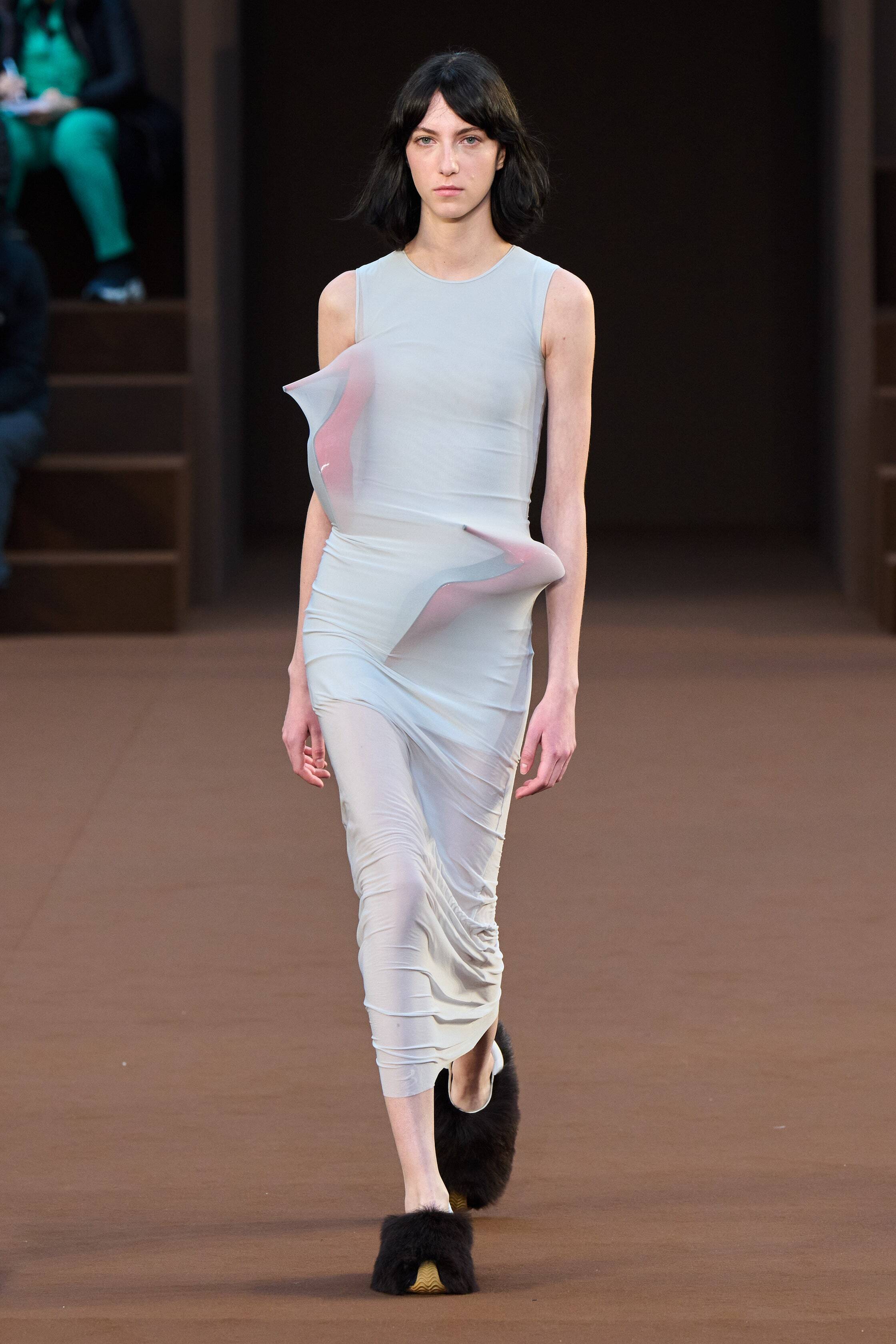 Основной коммерческой силой Loewe остаются сумки и другие изделия из кожи, но с каждым сезоном креативный директор Джонатан Андерсон сильнее смещает акцент на одежду. В сезоне осень-зима 2022 скульптурные кожаные платья имитируют драпировки, словно юбку сдувает ветер, подолы повторяют очертания автомобиля, как бы абсурдно это ни звучало, а пояса замшевых брюк сами по себе взмывают в воздух. Из других сюрреалистичных деталей — бра в виде сдувшихся воздушных шариков, туфли на шпильках, которые прячутся под сеткой топов, создавая острые углы, принты trompe l’oeil с очертаниями тела и платья с грудью в форме губ.