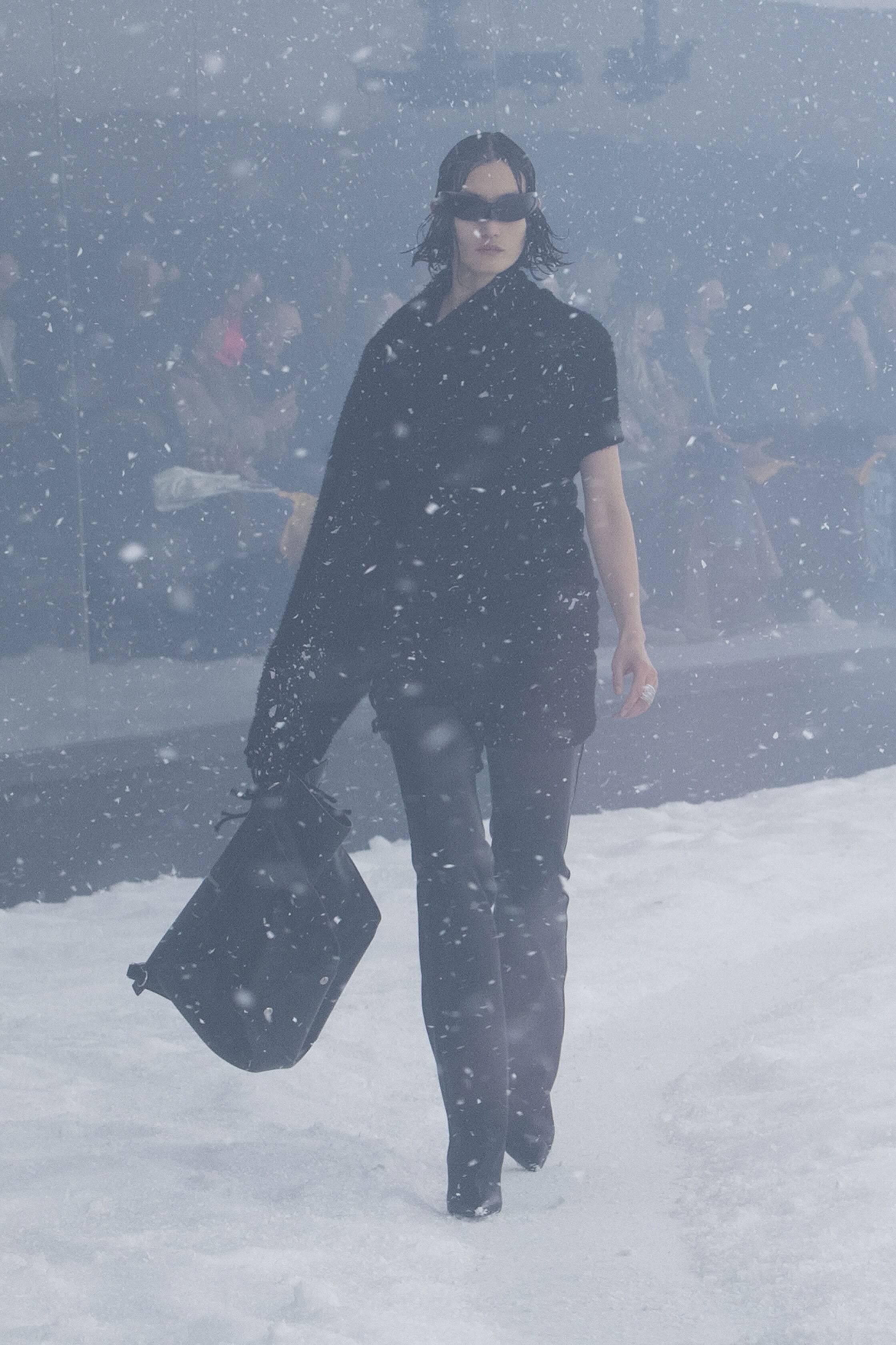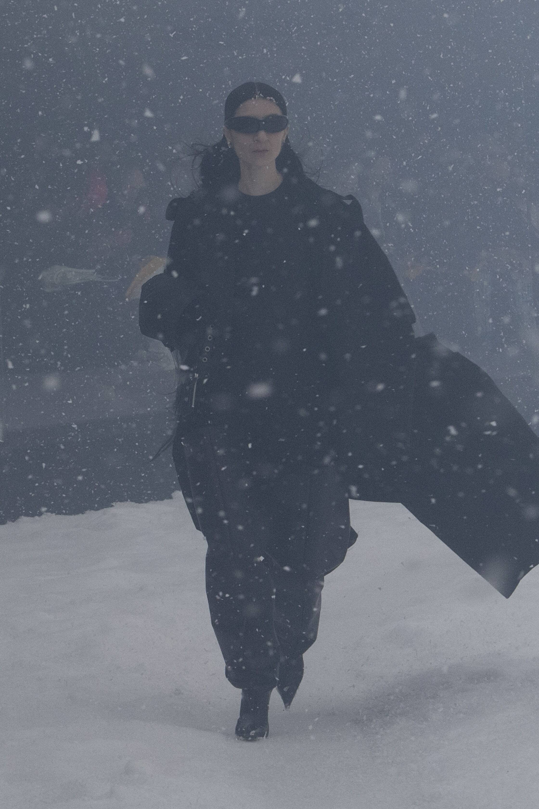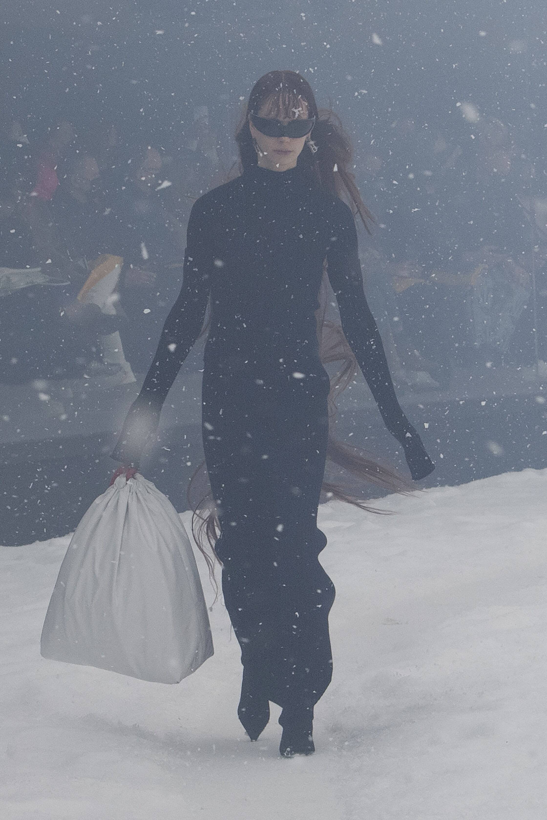 «Живи, Україно, живи для краси, для сили, для правди, для волі», — этими строчками, зачитанными самим Демной, начинается показ Balenciaga. Далее под мелодию из «Славянских танцев» чешского композитора Антонина Дворжака модели дефилируют под снегопадом. В черных балахонах, рваных платьях, на шпильках, которые проваливаются в снег, и с сумками, напоминающими мусорные пакеты. В связи с последними событиями в Украине неминуема ассоциация с беженцами — можно было бы, наверное, обвинить дизайнера в цинизме, если бы не личная история Демны. Во время грузинско-абхазского конфликта 1992–1993 годов семья Гвасалии вынуждена была бежать из Грузии: «Во мне отзывается боль прошлой травмы, когда такие же события произошли в моей стране и я навсегда стал беженцем. Навсегда, потому что это остается в тебе. Страх, отчаяние, осознание того, что тебя нигде не ждут. Неделя моды в такое время кажется абсурдом. Я думал отменить показ, но потом понял, что отменить — значит сдаться, капитулировать перед злом, которое мучило меня почти тридцать лет».