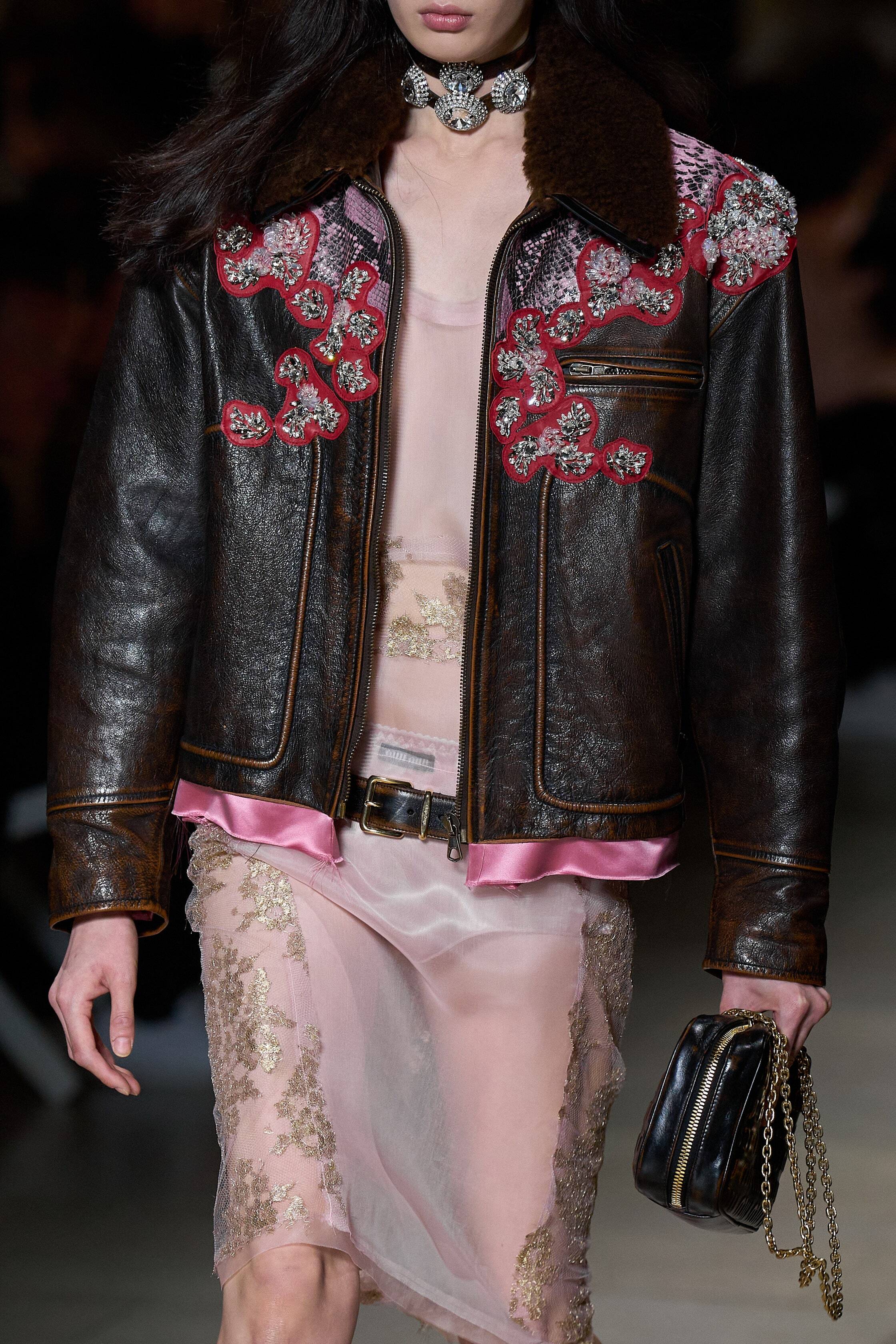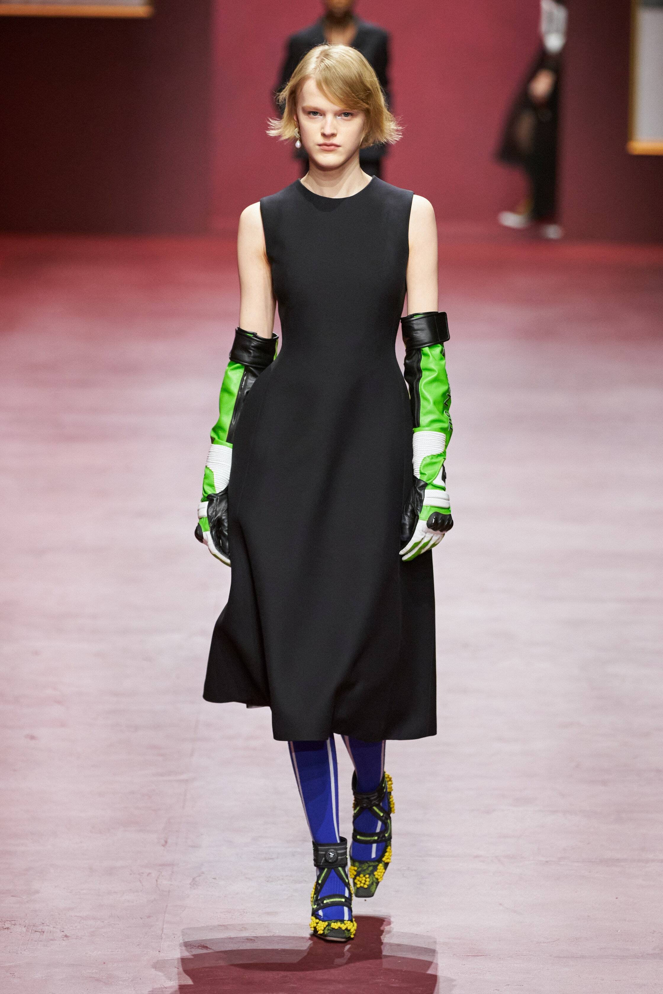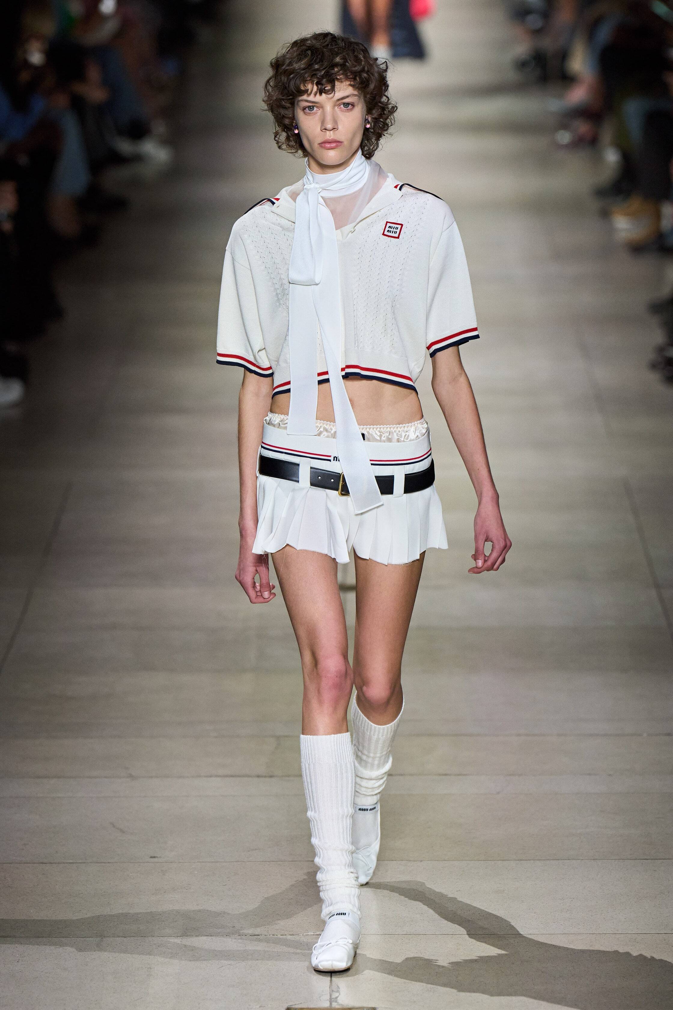 Вы наверняка видели мини-юбки из весенне-летней коллекции Miu Miu, которые захватили обложки журналов и первые полосы инстаграма. В новом сезоне Миучча Прада продолжила работать с вещью-мегахитом: теперь юбка выглядит более спортивной, плюс из-под нее выглядывает атласное белье. Также есть гибриды кружевных блузок и спортивных поло, микрошорты и куртки из потертой кожи в кристаллах. Плюс коллекция запомнится мужскими образами — кожаными брюками со змеиным принтом, трикотажными костюмами и все теми же юбками на низкой талии. В прошлом у Miu Miu уже была мужская линия: с 1998-го по 2000-й над коллекциями работал Стефано Пилати, в 2008 году линию закрыли.