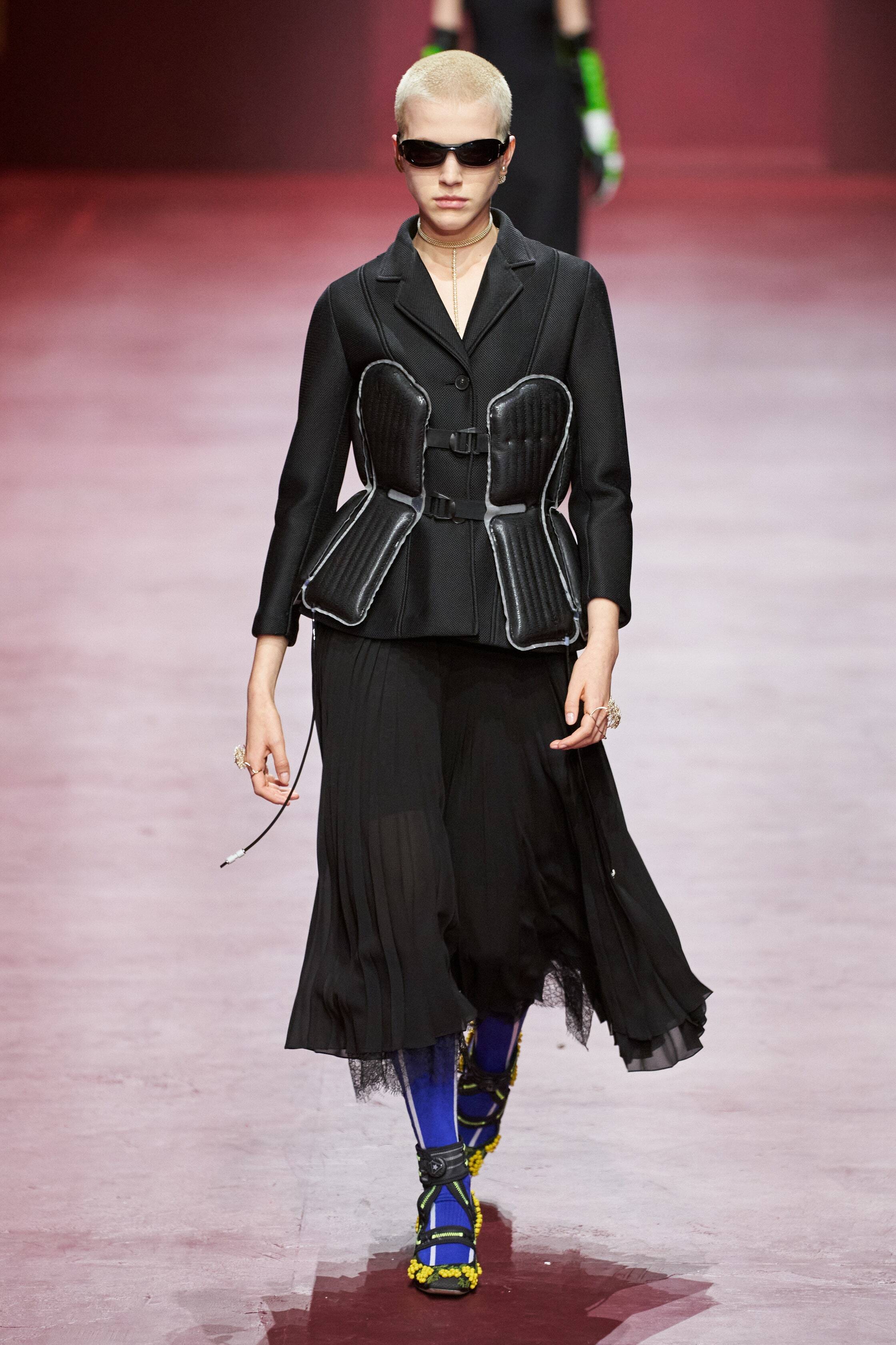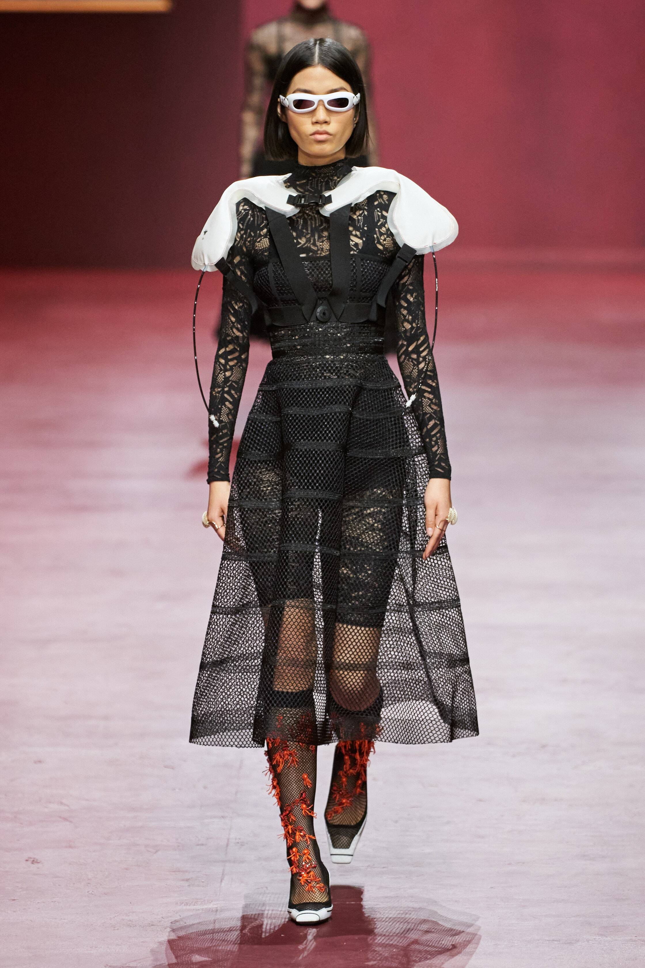 Мария Грация Кьюри работала над коллекцией вместе со стартапом D-Air Lab. Компания занимается разработками в сфере безопасности: среди ее изобретений есть монокостюм для исследователей в Антарктиде, который позволяет работать при —80°C, подушки безопасности для рабочих-высотников и защитные жилеты для трейловых бегунов с кнопкой безопасности в случае падения или нападения. Итогом сотрудничества Dior и D-Air Lab стали технологичный жакет Bar, который контролирует температуру тела, обтягивающий комбинезон (catsuit) со светящимися в темноте трубками и мотоциклетные куртки с защитой. Образы с кружевными топами и макси-юбками дополнили элементы в виде подушек и жилетов безопасности.