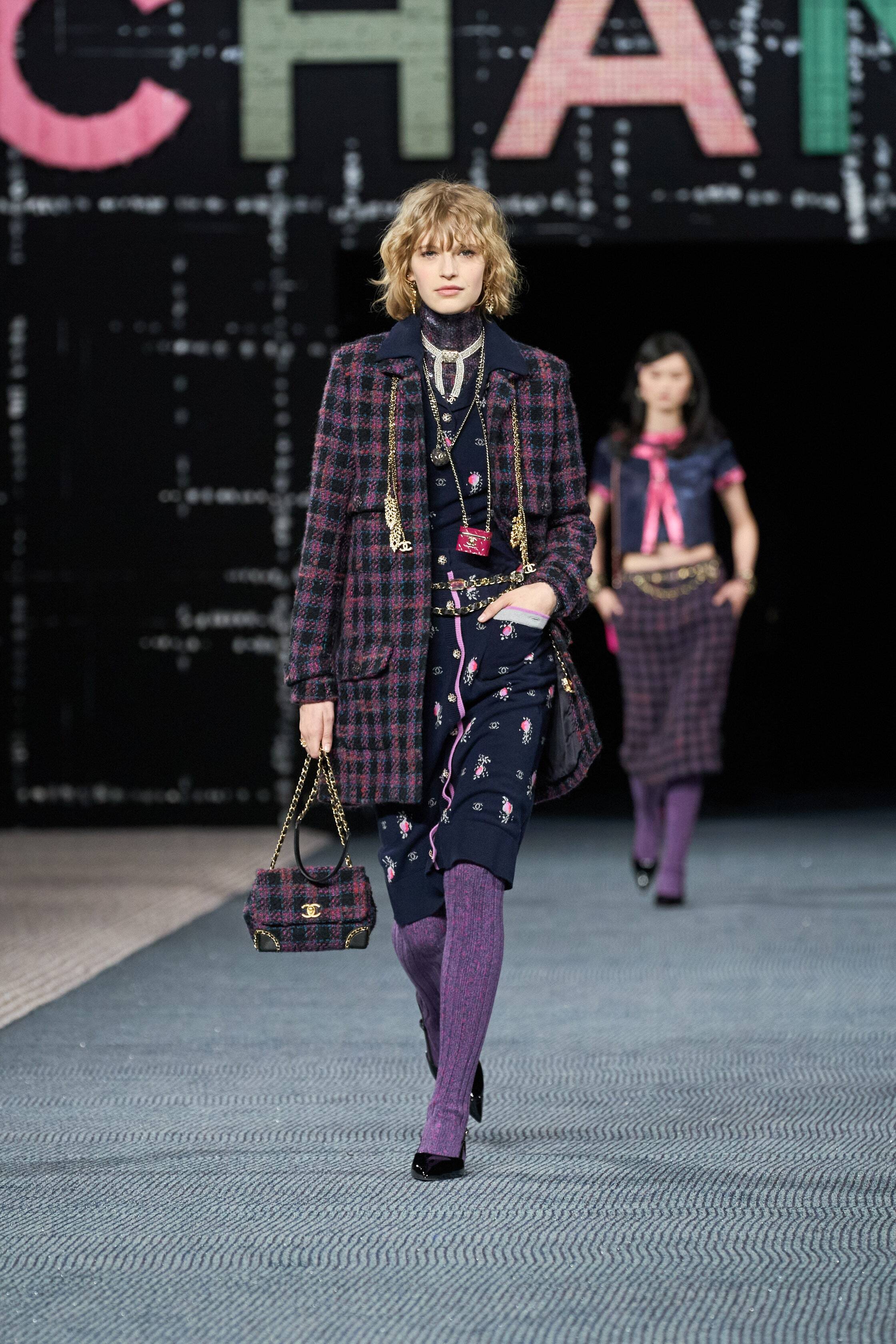 В новой коллекции Виржини Виар поднимает на щит твид — один из главных кодов дома Chanel. Костюмы из этого материала Габриэль Шанель начала шить в 1920-х годах. Считается, что любовь Шанель к твиду выросла из пиджаков герцога Вестминстерского, с которым у нее был роман. Старый добрый твид в коллекции преображается до платьев, жокейских брюк и множества пальто. Одно из пальто — розовое в цветную крапинку, в котором открывала шоу модель Вивьен Ронер, — вдохновлено шотландскими пейзажами. Виар говорит, что Шанель собирала на прогулках букеты, а потом приносила их местным мастерам с пожеланием получить такие же оттенки. Плотные шерстяные колготки и резиновые сапоги тоже можно принять за отсылки к дресс-коду британской сельской местности.
