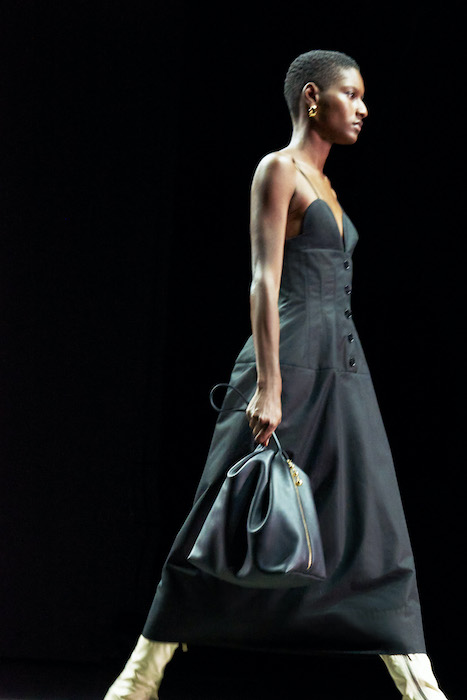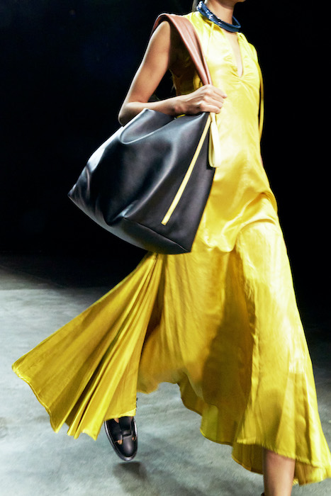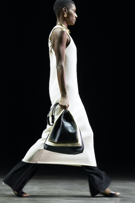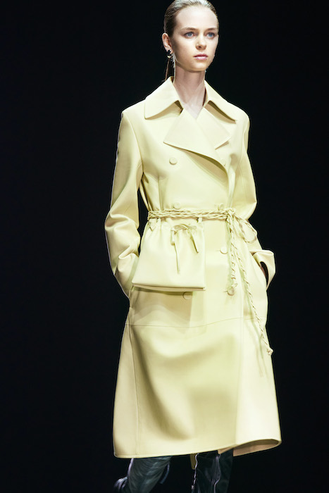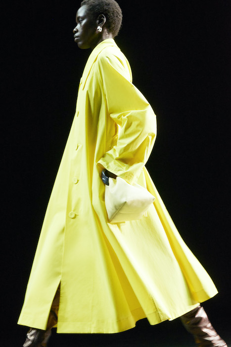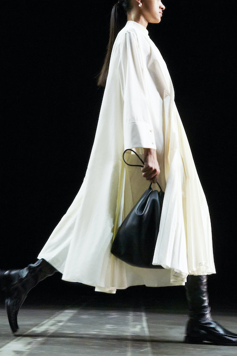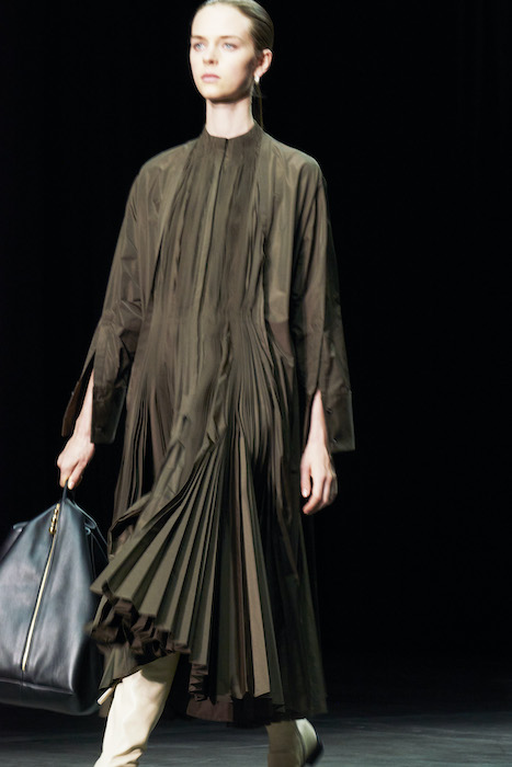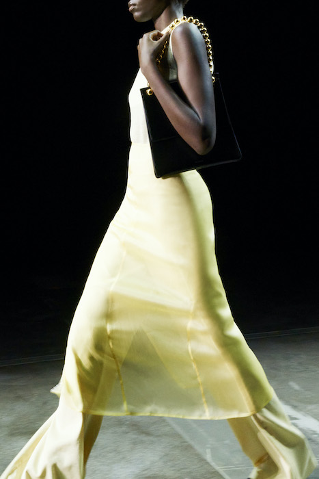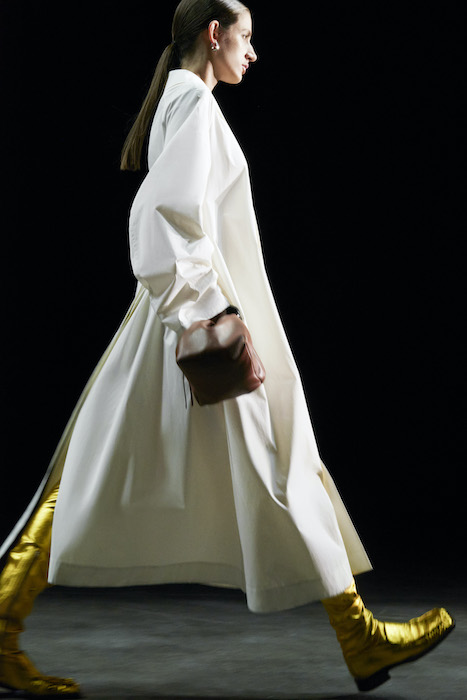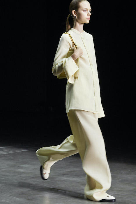 Jil Sander не провел показ на Неделе моды в Милане, как обычно, — новую коллекцию креативные директора Люси и Люки Мейер представили в формате видео на IGTV. В нее вошли плиссированные платья чистых силуэтов, приталенные плащи и множество костюмов: от моделей из строго серого твида до совсем невесомых вариантов из шелка. Акценты в коллекции расставлены с помощью вышивки, больших пуговиц, воротников и украшений из черной кожи на шею. Плащи подпоясываются сплетенным вручную ремнем, на который крепится сумка. Обувная линия включает босоножки с липучками на крошечном каблуке, сапоги с квадратным носом и вариации рыбацких сандалий.