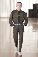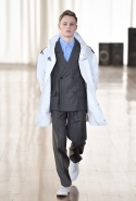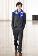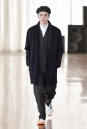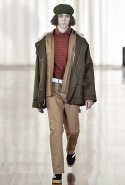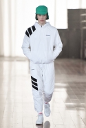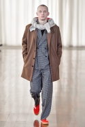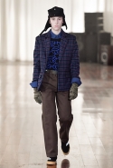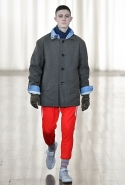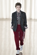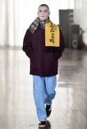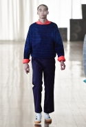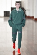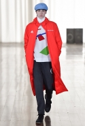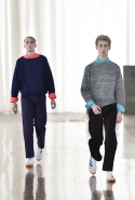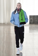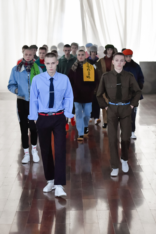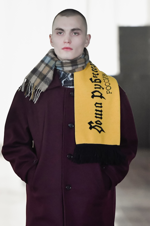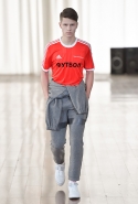 Стайлинговые приемы и аксессуары: цветные ремни, многослойность, свитера, повязанные как шарфы, вязаные галстуки, береты и кепки, винтажные советские значки, широкие вязаные шарфы с надписью «Гоша Рубчинский Россия», бутсы ACE 16+ SUPER с верхом Primeknit в красном, белом и черном цветах (каждая модель дополнена серым носком и надписью «adidas | Gosha» на подошве)