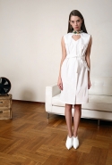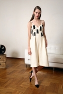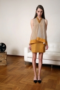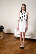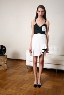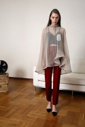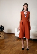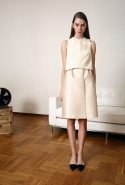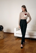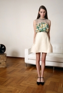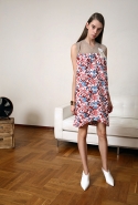 Во всех этих вещах есть какой-то неуловимый налет ретро: силуэты кажутся знакомыми, а сама история о впервые влюбившейся девушке, главной героине коллекции, напоминает словно стершийся из памяти советский школьный фильм. Главным символом, который проходит через все образы от начала до конца, стало сердце. Его дизайнер любовно вышивает на пестрых и нежных платьях, покрытых цветами словно с принтов 70-х годов, вырезает между ключиц, цепляет на грудь к топам-бюстье, обшивая бахромой, словно погоны.