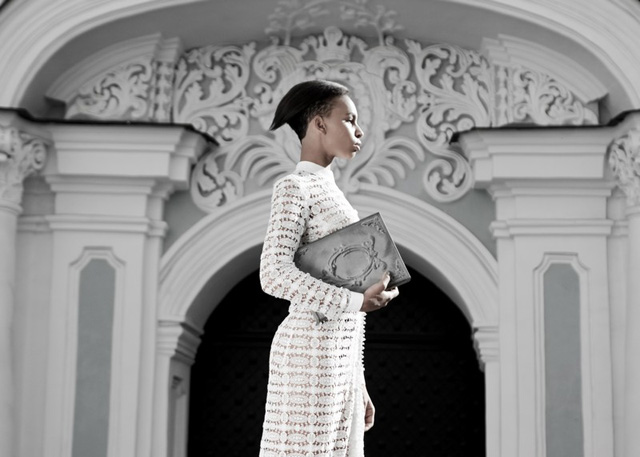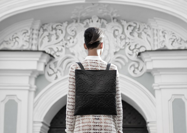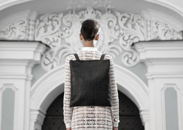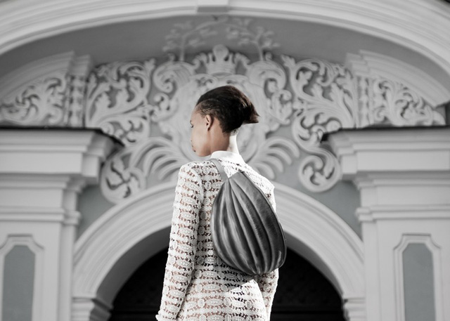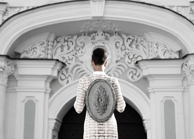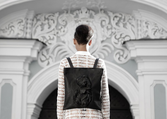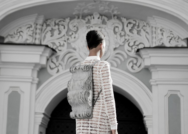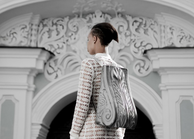Формы рюкзаков из новой коллекции сезона весна-лето 2016 полностью повторяют очертания и изгибы барочной лепнины. Выглядит более чем реалистично — кажется, что за плечами моделей настоящие архитектурные элементы фасада, на деле же это формованная кожа, которую для пущей схожести с лепниной соответствующим образом еще и покрасили.