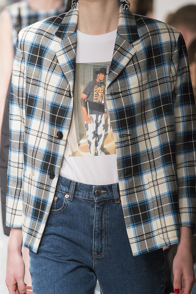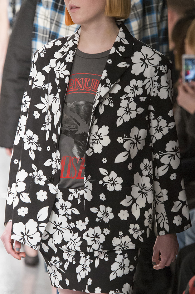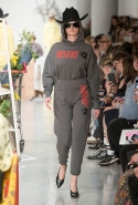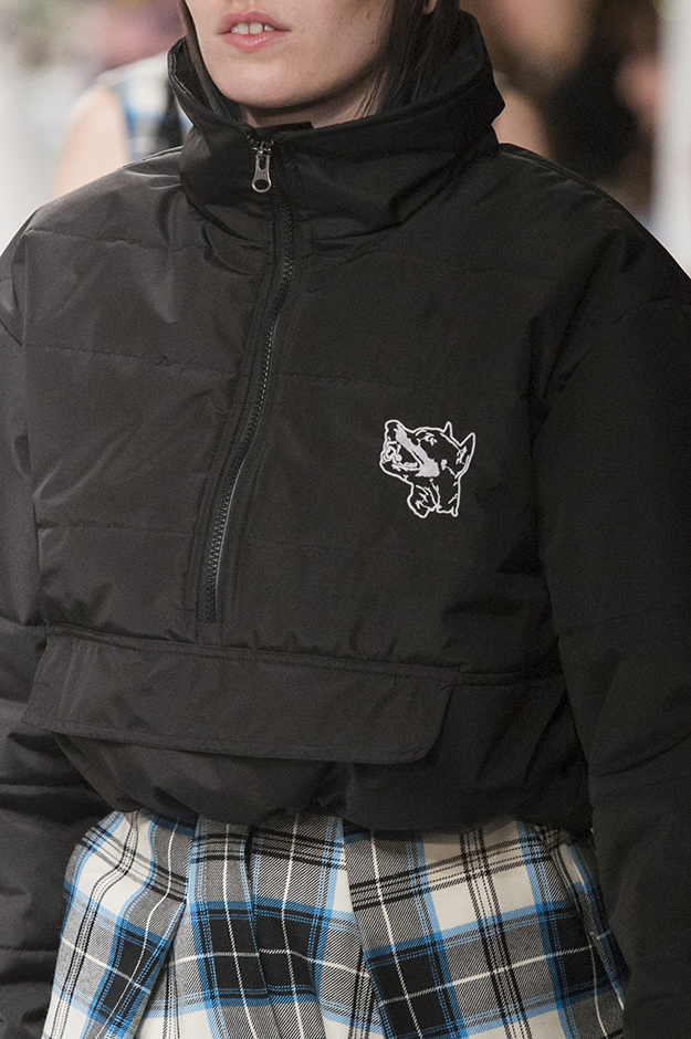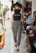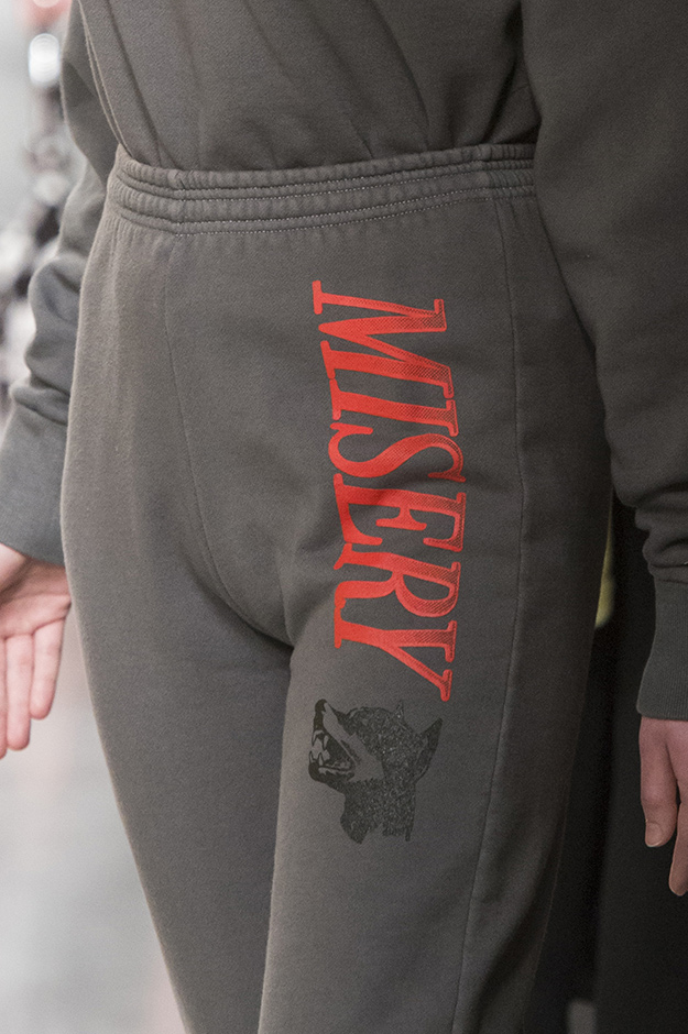 Помимо того, лейтмотивом шоу стали худи и треники, в изобилии представленные в коллекции. Одежда пестрила слоганами: от активистских «Save the Planet» до депрессивной повторяющейся надписи «Misery» в сочетании с головой добермана.