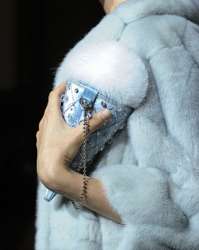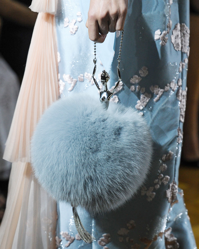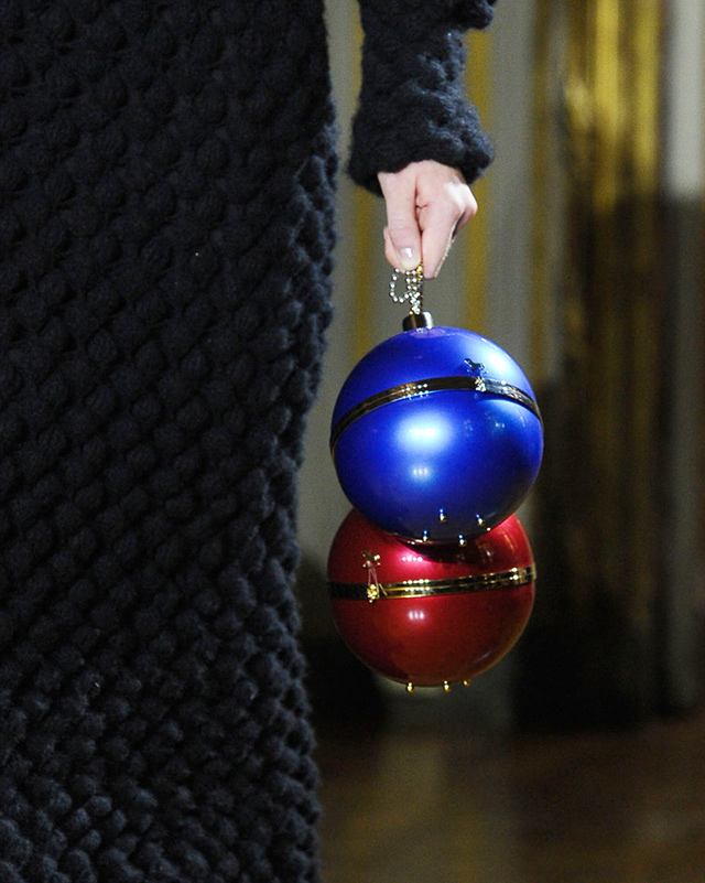 Аксессуары в коллекциях Ulyana Sergeenko — всегда запоминающиеся и яркие, под стать самим коллекциям, но чуть менее серьезные. К очень красивым вещам, созданным под впечатлением от «Цвета граната» Параджанова и Грузии, дизайнер, например, добавила круглые сумки в виде курочек и фляг с водой. На этот раз перепад от серьезного к несерьезному вышел таким же резким. Сама «коммунальная» осенне-зимняя коллекция на самом деле кажется довольно грустной: ее героини выглядят потерянными и в своих шелках и меховых манто совершенно не соответствующими духу нового, советского времени. А аксессуары у них в руках нарочито игривы и ту же советско-коммунальную эстетику представляют уже в совершенно ином, ироничном и ностальгическом ключе.