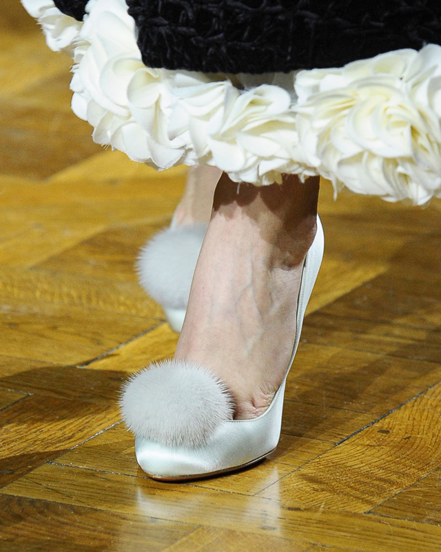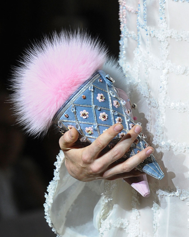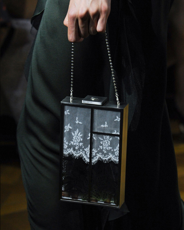 Сумки здесь в виде рожков мороженого — с пушистыми помпонами на месте самого шарика мороженого. На туфлях-лодочках, созданных в сотрудничестве с Christian Louboutin, красуются такие же меховые помпончики — таких туфелек, конечно, не было у средней обитательницы советской коммуналки. Зато наверняка были у девушек, похожих на героиню Светланы Светличной в «Бриллиантовой руке». Есть еще и сумочки в виде окон, украшенные традиционными «зимними садами» — то есть батареями горшков с цветами, выстроившимися на подоконнике. Но даже такие бытовые моменты Ульяна Сергеенко и ее команда обыгрывают с кутюрной тщательностью: клатч украшен кружевными и цветочными вставками, расшитыми вручную.