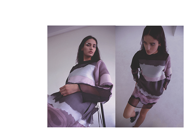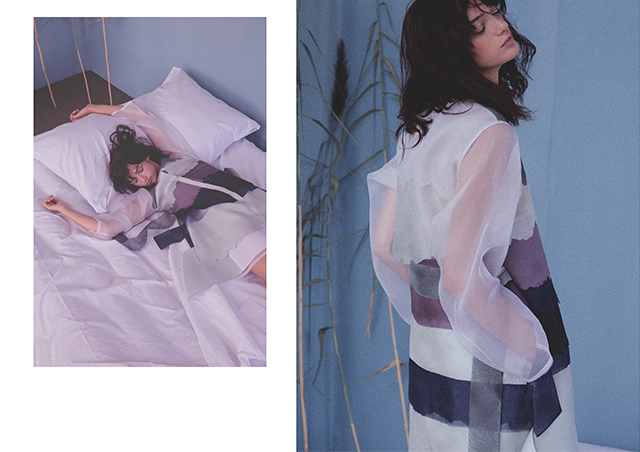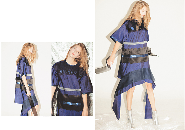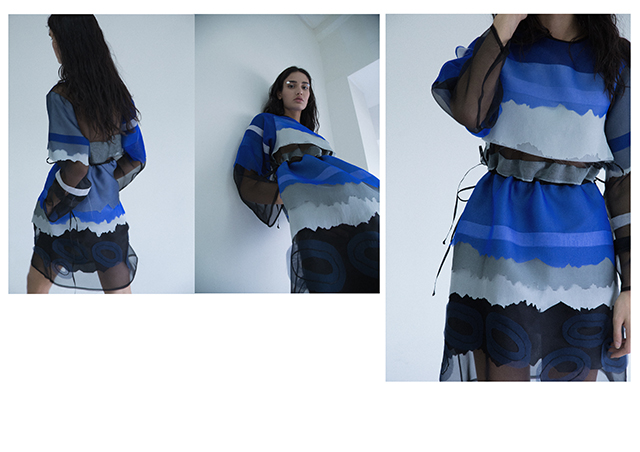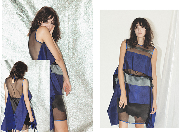 Самая яркая и впечатляющая часть коллекции собрана как раз из световых полос, в которые превращается с наступлением темноты свет фар несущихся по дороге машин. По черной органзе бегут электрические синие и серебристые линии, местами мешаясь с золотом и другими более теплыми тонами. Первые напоминают о глубокой ночи, вторые — о приближающемся рассвете, когда темнота сменяется нежными и рассеянными розоватыми лучами.