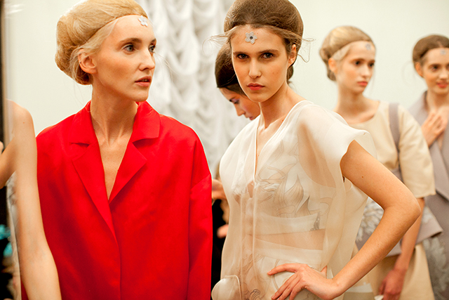 В огромном просторном зале Дома Пашкова места хватило всем гостям, пришедшим поздравить сестер Рубан с очередной творческой удачей: такого длинного первого ряда, кажется, не было еще ни на одном российском показе нового сезона. А вот моделям, готовящимся к выходу, досталось куда меньше места для сборов: девушки собрались в небольшой комнатке, где их переодевали лично сестры Рубан и их ассистенты, красили визажисты Nars и колдовали над прическами специалисты из итальянских центров красоты Aldo Coppola. Магия по традиции творилась в тесноте, но не в обиде, и по-настоящему звездные модели, как Ирина Николаева, совершенно свободно общались с девушками-новичками.