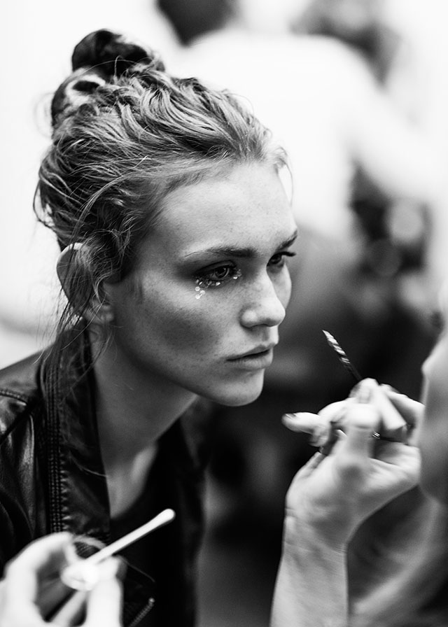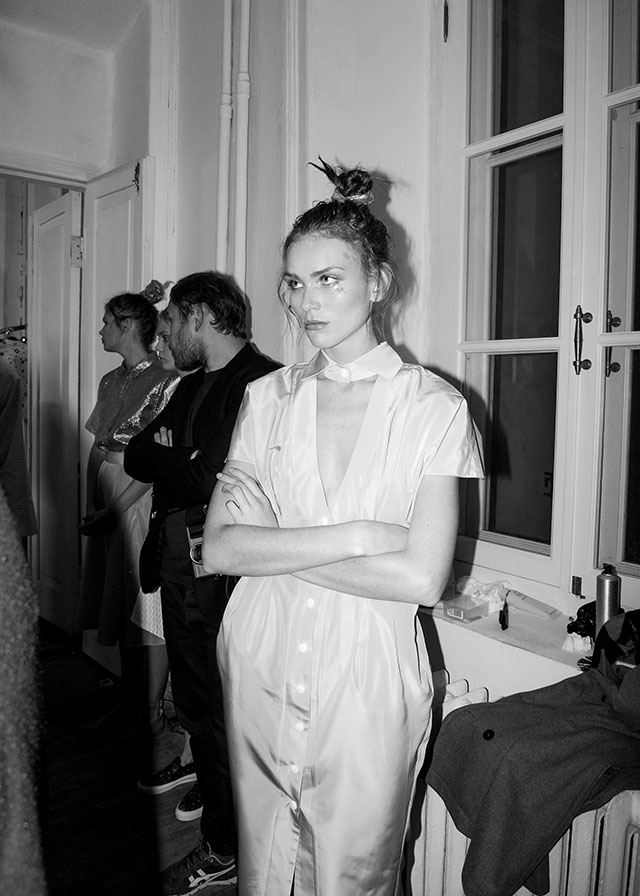 На головах — небрежно собранные пучки, под глазами — мерцающие потеки из блесток, к вискам тянутся серебряные размашистые стрелки, а в ресницах мерцают крупные сияющие частички. Этот праздничный блеск сразу бросается в глаза и на снимках фотографа Дмитрия Роллинса, побывавшего за кулисами показа Андрея Артемова в Нескучном саду. Готовили моделей к выходу на импровизированный подиум в стенах летнего дома графа Орлова, с его крылечка они и спускались к зрителям, и на его балконе выстроились все вместе во время финального выхода.