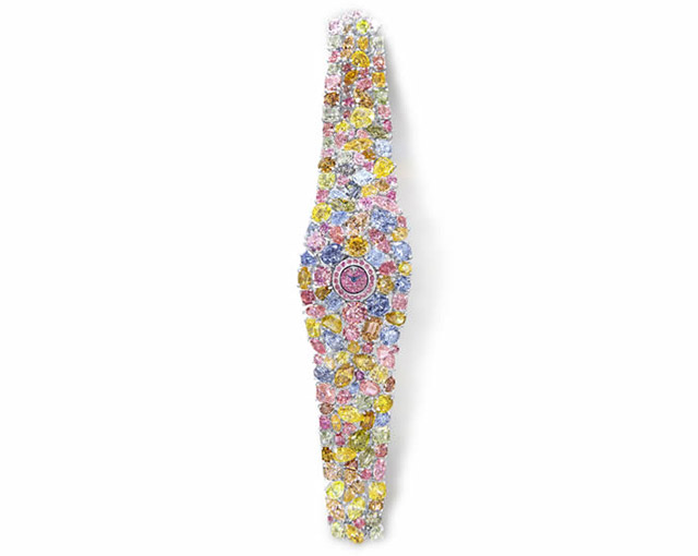 Еще одну "галлюцинацию" представила мануфактура Graff Diamonds. Свое творение, в буквальном смысле ослепляющее яркостью и помпезностью, британские ювелиры, не мудрствуя лукаво, так и назвали — Hallucination (с англ. — "галлюцинация"). Часы представляют из себя калейдоскоп из разноцветных бриллиантов, общая каратность которых достигает 100 единиц.