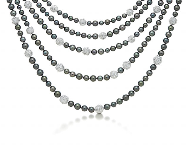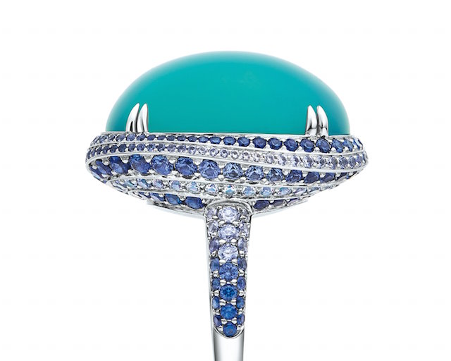 Кольца, массивные ожерелья и длинные серьги украшены черными опалами, голубыми и желтыми бриллиантами, аквамаринами, сапфирами и, конечно же, главным природным сокровищем океана жемчугом. В коллекции представлены изящные коктейльные кольца с жемчугом, струящиеся серьги, роскошный перстень с центральным бриллиантом в цвете Fancy Intense Blue весом около трех карат, колье-пластрон из бирюзы и еще ряд других сокровищ.