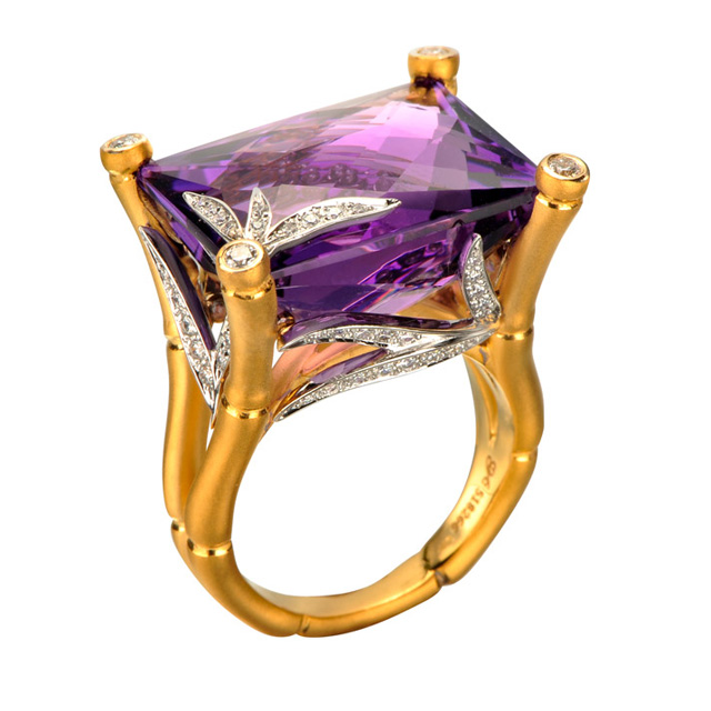 Испанская ювелирная компания обновила коллекцию Bambú. Новые украшения добавили ярких красок в прежде спокойную линию драгоценностей. Carrera y Carrera представили два роскошных коктейльных кольца, декорированных цветными камнями — розовым кварцем и аметистом, а также более сдержанный комплект — кольцо, серьги и кулон из желтого и белого золота с бриллиантами.