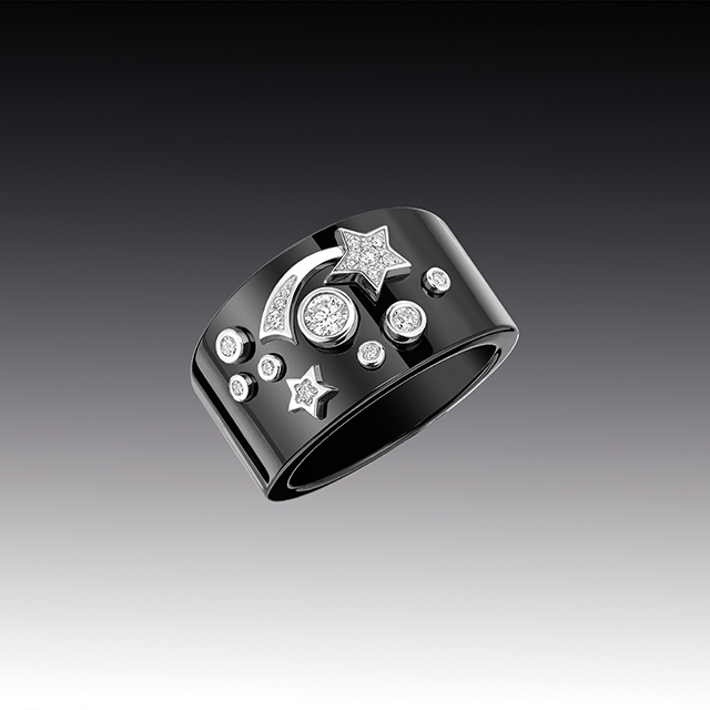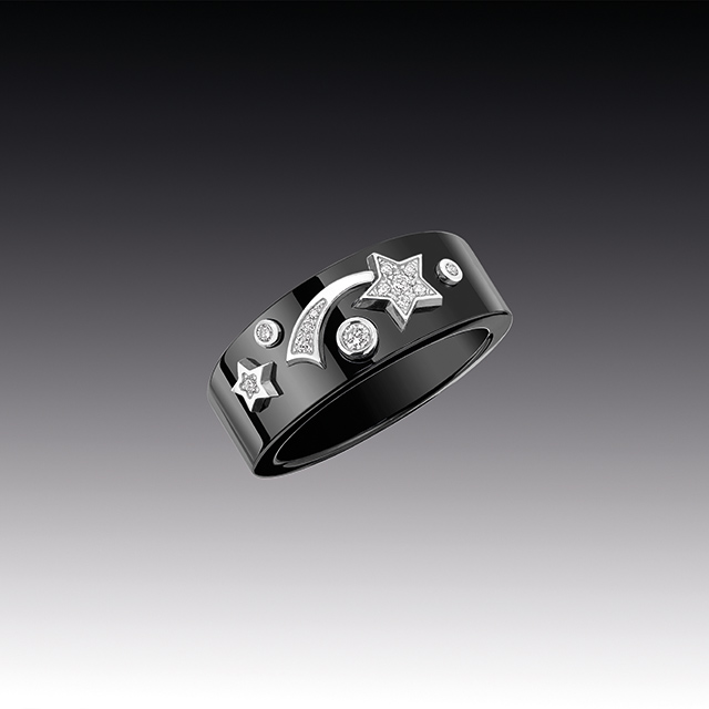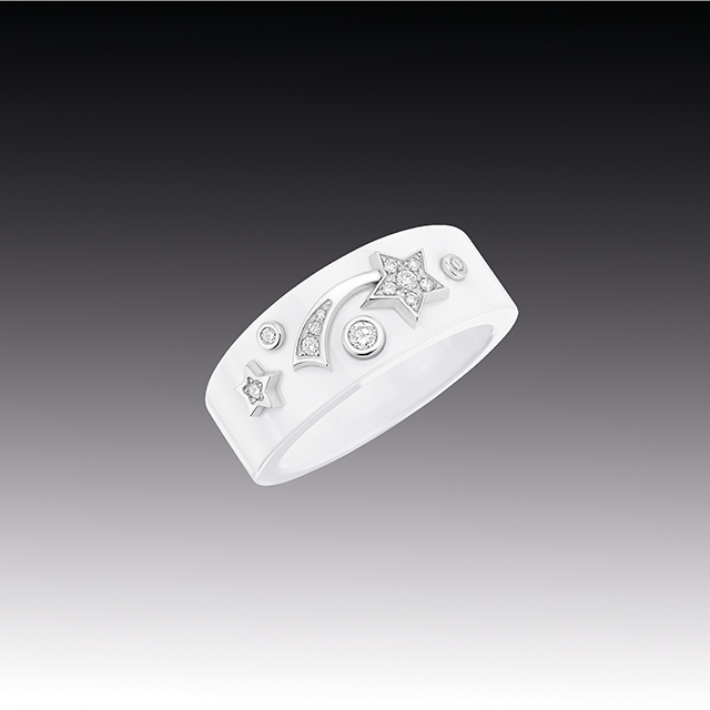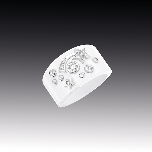 Дизайнеры украшений Chanel решили не подходить к космической теме слишком серьезно и не пытались искать ни жизни на других планетах, ни смысла жизни в нашей Галактике. Хвостатые кометы, приземлившиеся на эти браслеты и подвески, не несут никакой угрозы планетарного масштаба — и кометы, и звезды выглядят так, словно нарисовал их добрый художник-мультипликатор. Хотя материалы, из которых созданы эти забавные и немного инфантильные украшения, вряд ли назовешь детскими. Округлые и гладкие основы для массивных браслетов, подвесок на шею и колец сделаны из фарфора, зато в каждой звездочке (и в каждой комете) сияет отдельный бриллиант, обрамленный белым золотом.