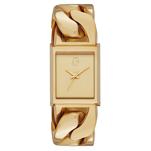 В осенне-зимнюю коллекцию будущего сезона вошли три женские модели, одна мужская и браслет Karl 7. Черная классическая новинка для сильного пола из матовой нержавеющей стали имеет толщину корпуса 12 миллиметров и стоит $295. Женская модель Karl 7 с покрытием из розового золота обойдется приблизительно в $225 (поставляется со сменным ремешком из кожи ящерицы). Модель Petite Stud из нержавеющей стали будет доступна в желтом, розовом золоте и черном цвете — их цена не сообщается. Зато известно, сколько будут стоить часы Marais со строгим прямоугольным циферблатом, на котором изображен профиль дизайнера, — от $275.