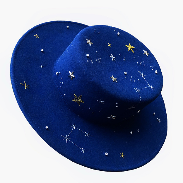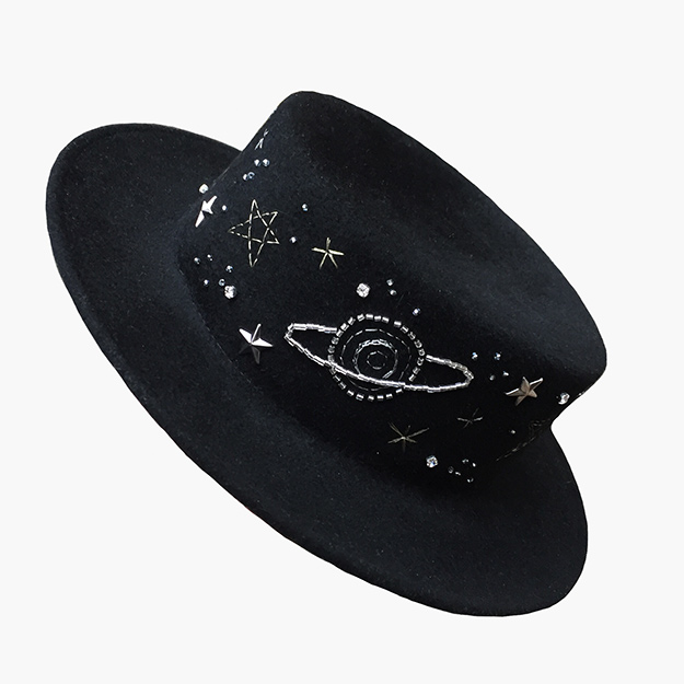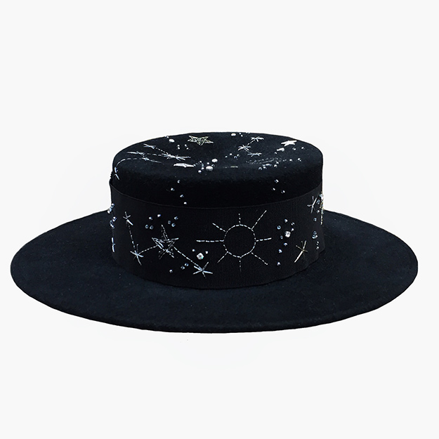 Новая коллекция посвящена символу первой звезды: федоры, канотье и фуражки декорированы вручную вышитыми планетами, звездами и кометами, с использованием металлической нити, бисера и кристаллов. «Я мечтаю, что когда-нибудь шляпа станет таким же обычным предметом гардероба, как обувь или сумка», – говорит миллинер.