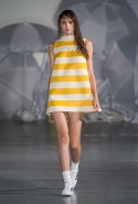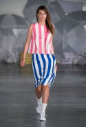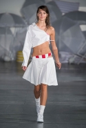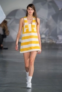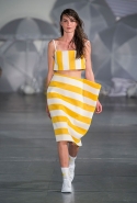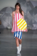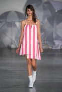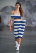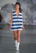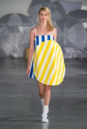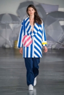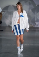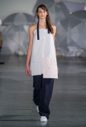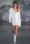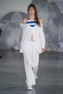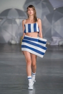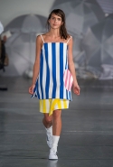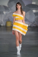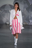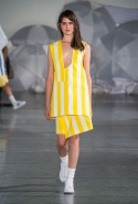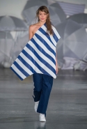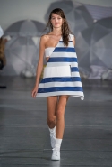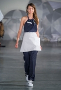 Молодой француз Симон Порт Жакмю не стал победителем конкурса LVMH Prize, но точно нисколько из-за этого не расстроился — его новая коллекция так же кричит о любви к жизни и молодости, как и ставшая хитом этой весны футболка J'aime la vie. Модели выходят на подиум с мокрыми волосами, словно только что выбежали на берег, вдоволь наплававшись в море. Жизнерадостные полоски, купальники, выглядывающие из-под рубашек и даже становящиеся их полноправными частями, — да, это точно история про самые лучшие на свете каникулы. Но лучше всего, конечно, платья, составленные из полосатой ткани разных цветов: желтый круг — солнце, синяя юбка — море, красный объемный топ — небо, ну а белые кроссовки — это просто кроссовки.