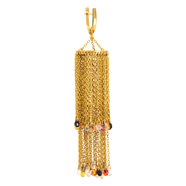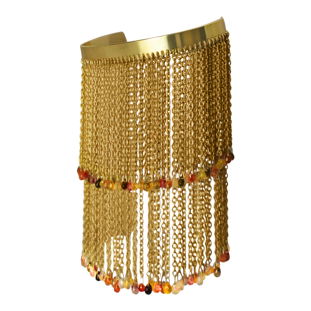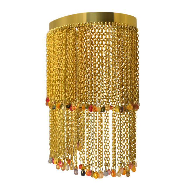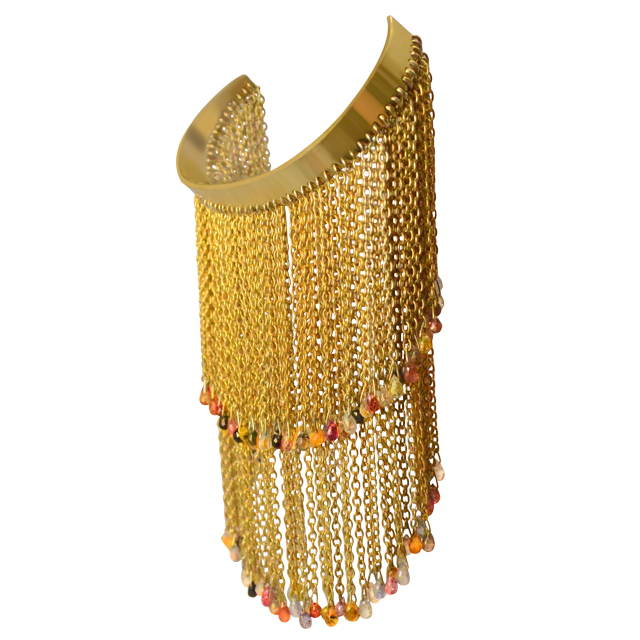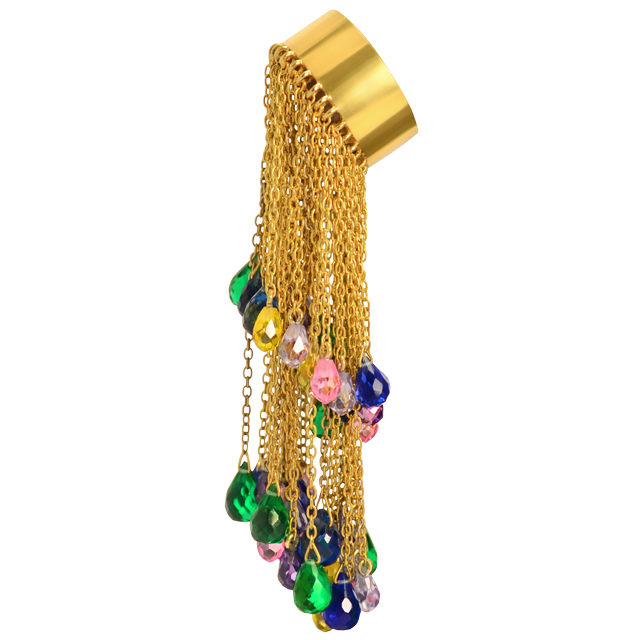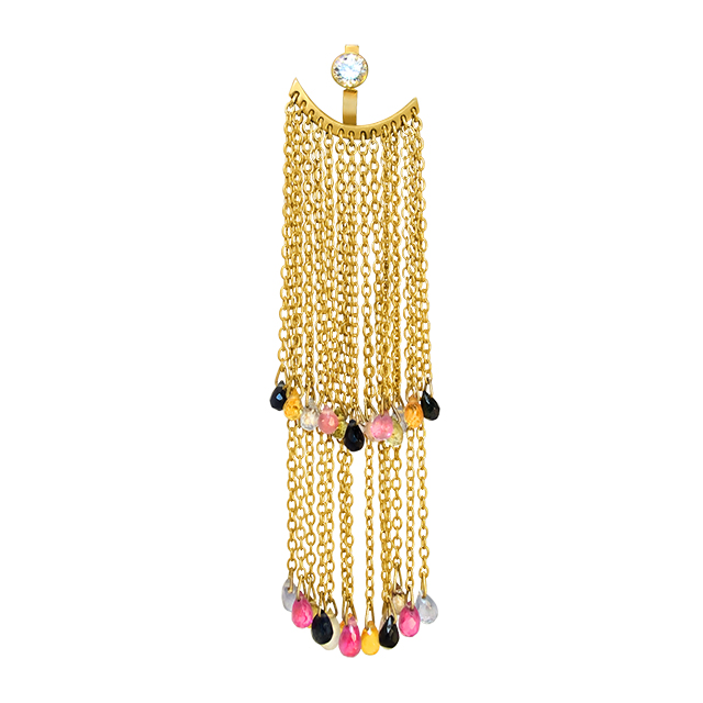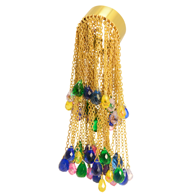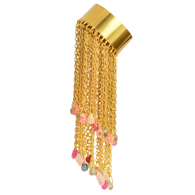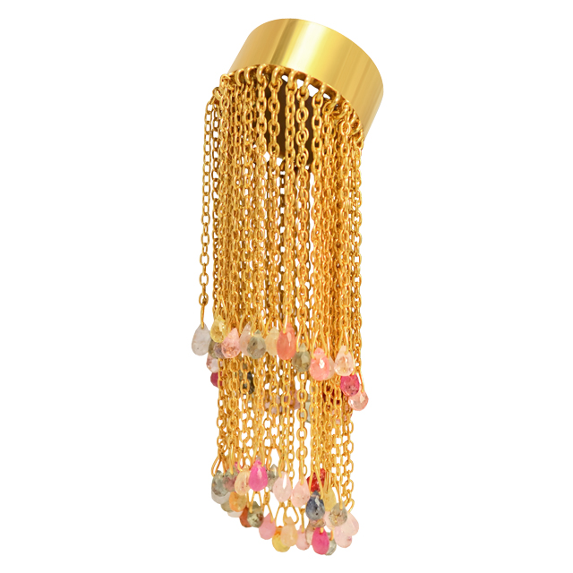Украшения кажутся очень простыми: это россыпи цепочек, скрепленных вместе, и нанизанные на них разноцветные яркие капли. «Леденцы» на поверку оказываются драгоценными, а сами цепочки выполнены из серебра 925 пробы с покрытием из 24-каратного золота и сапфиров. В продажу коллекция поступит в июне-июле.