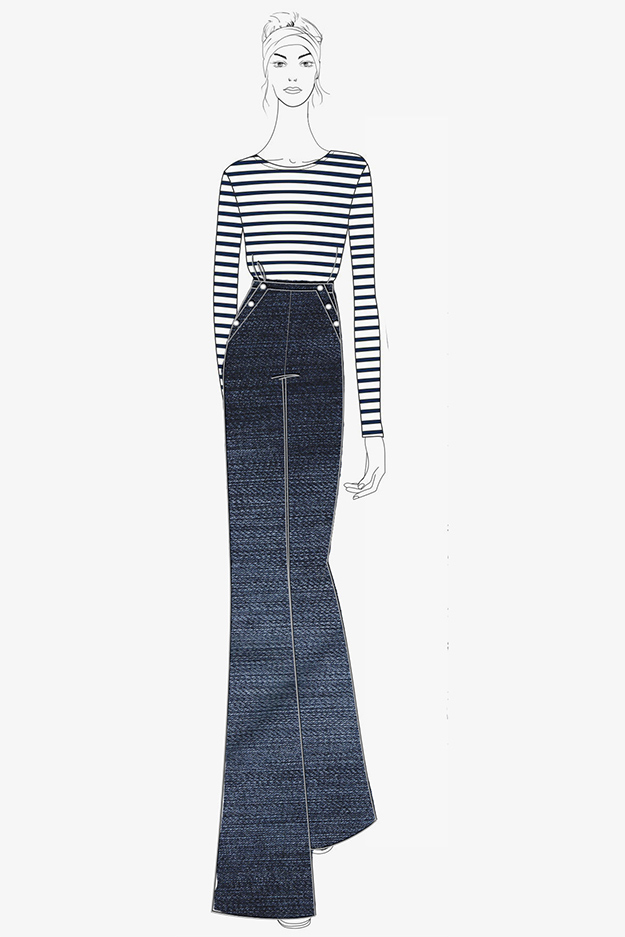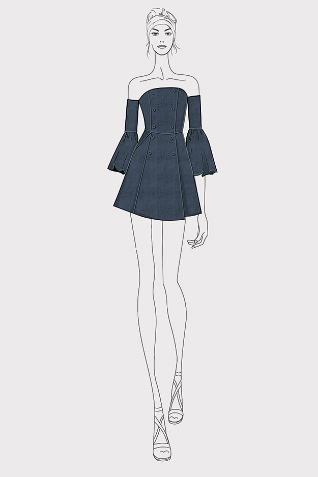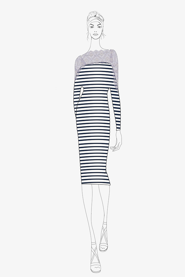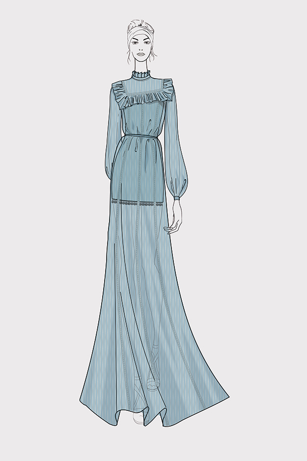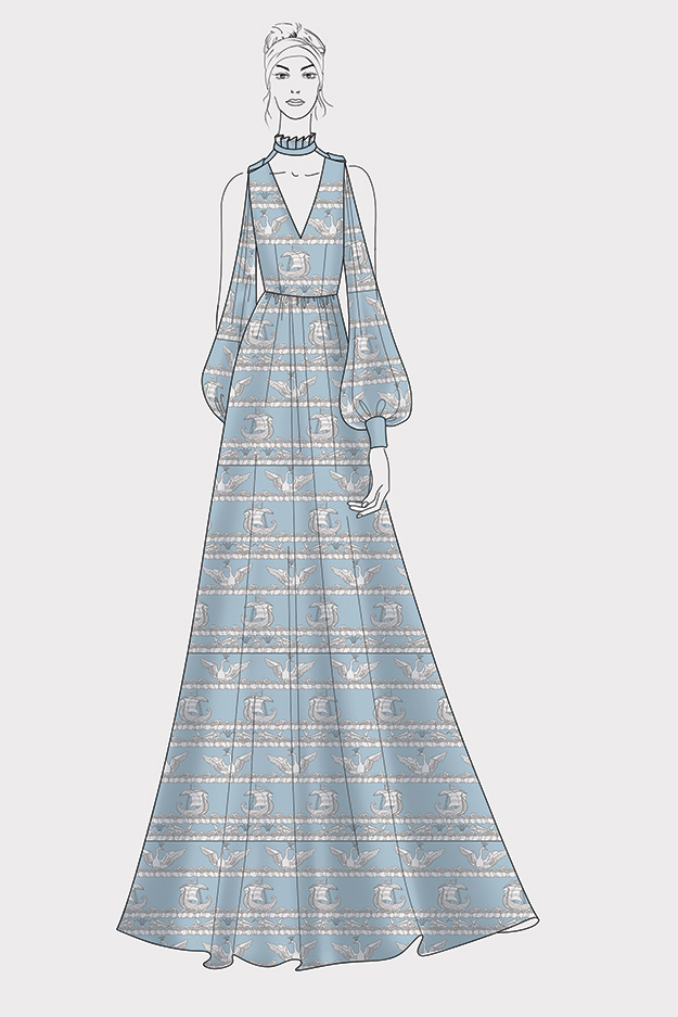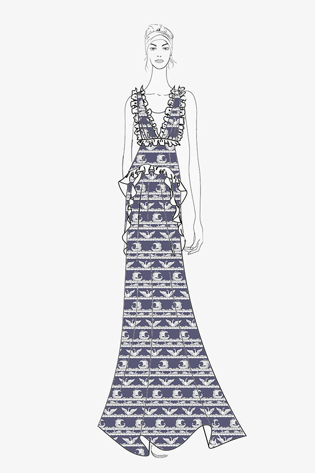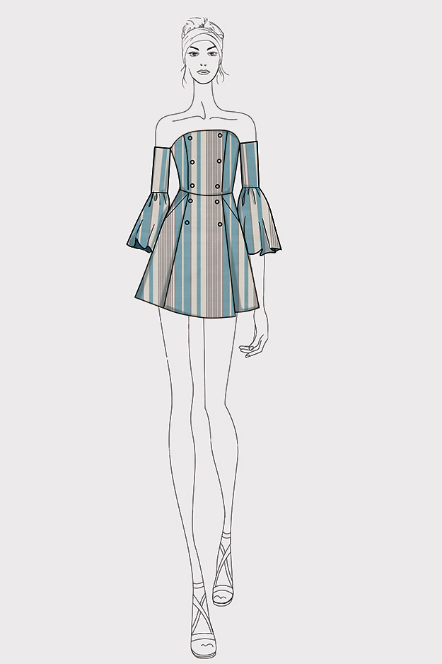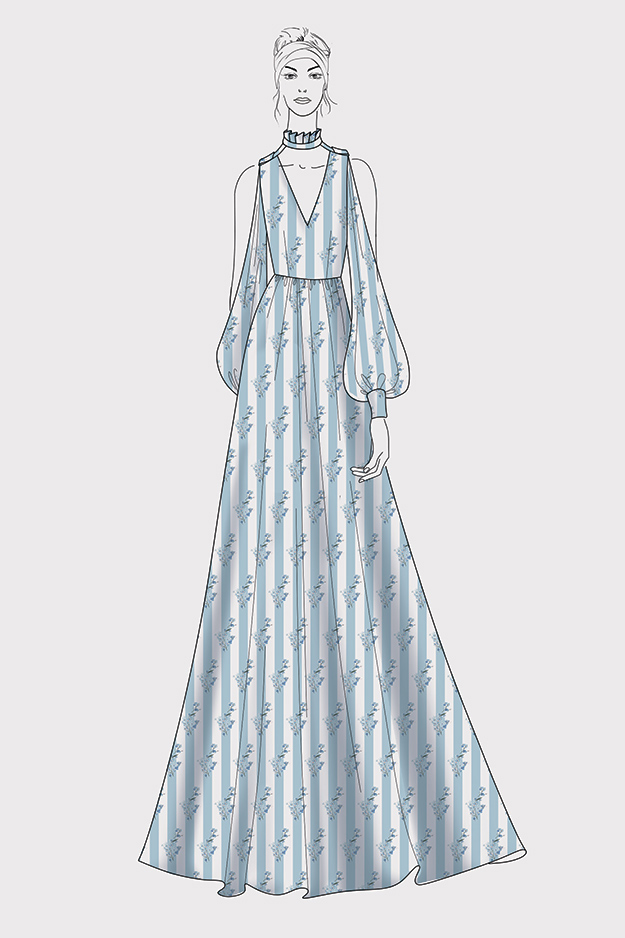 В эскизах A La Russe читаются референсы к моде начала ХХ века. Морская тематика в виде классической белой с синим полоски, стиль милитари (короткие платья на пуговицах с двух сторон наподобие мундиров), а также длина в пол и открытые плечи.