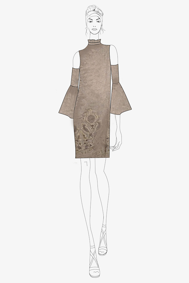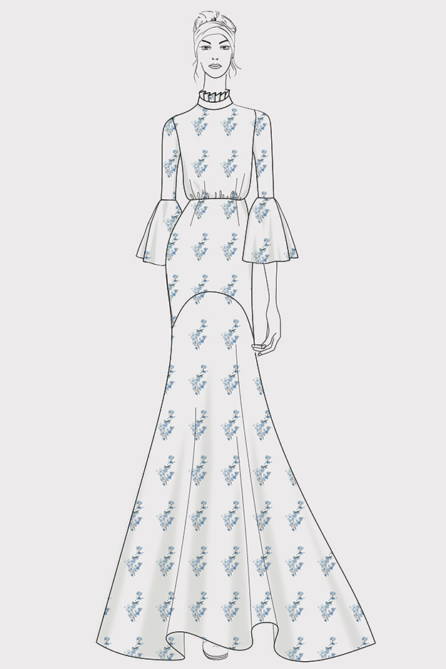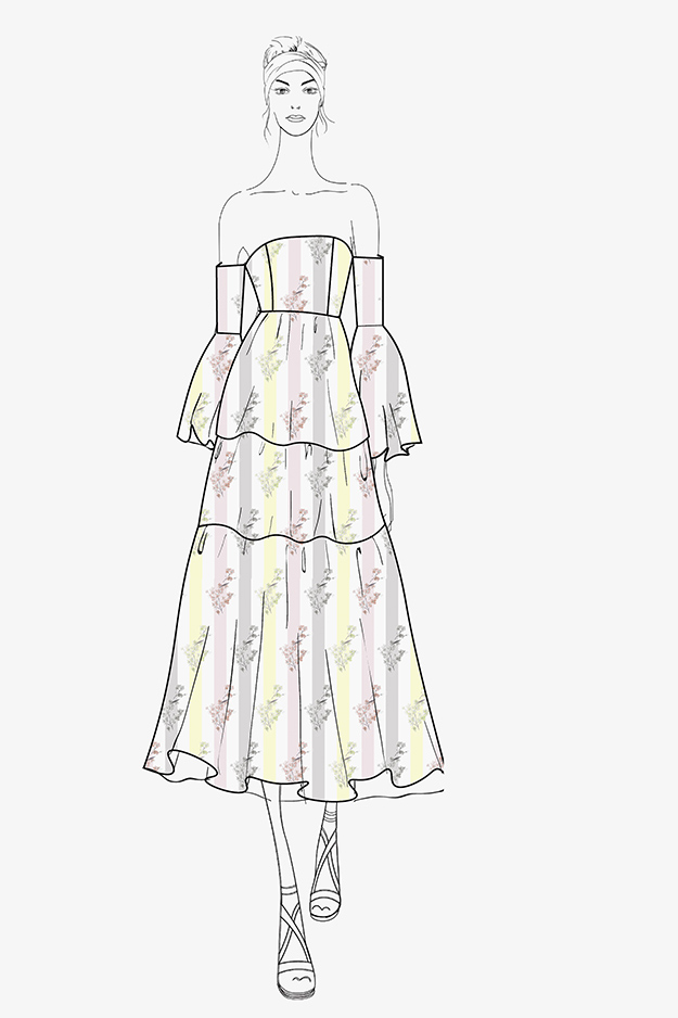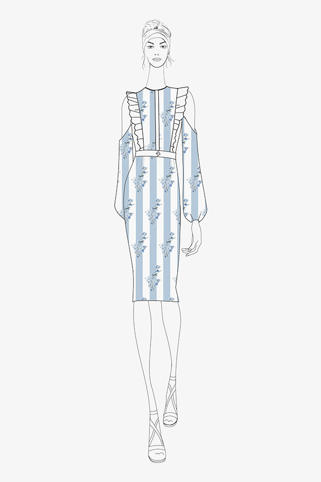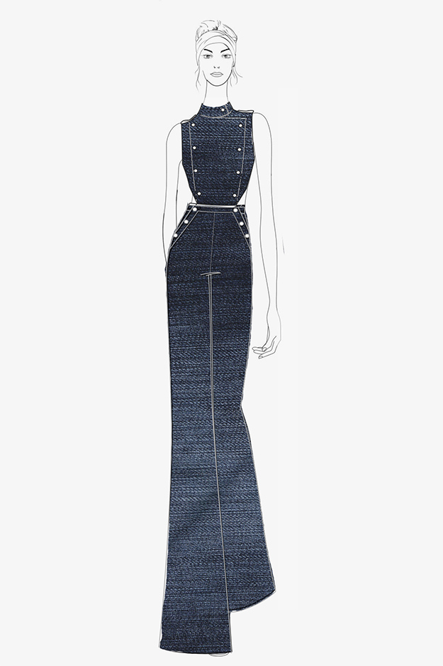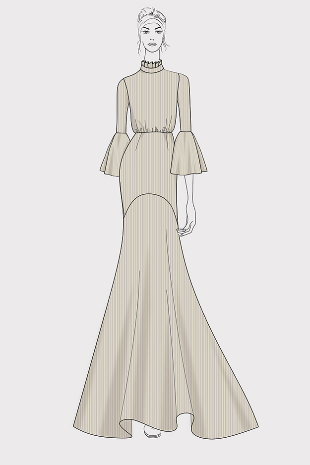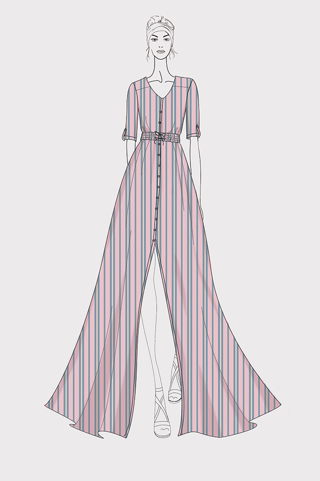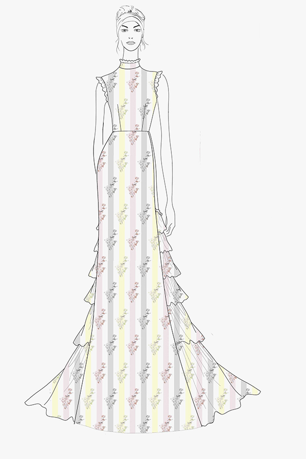 В эскизах A La Russe читаются референсы к моде начала ХХ века. Морская тематика в виде классической белой с синим полоски, стиль милитари (короткие платья на пуговицах с двух сторон наподобие мундиров), а также длина в пол и открытые плечи.