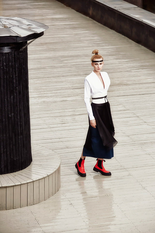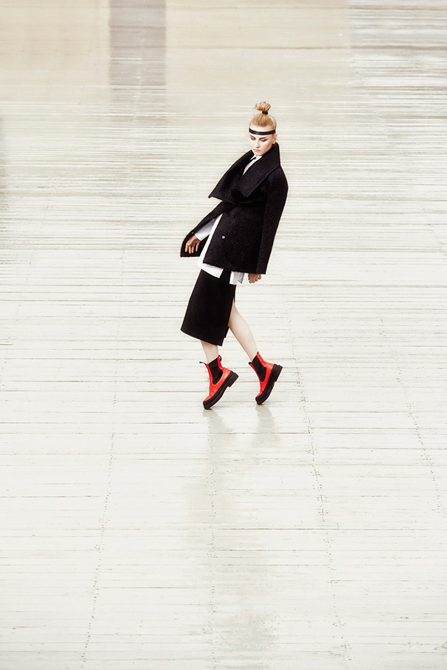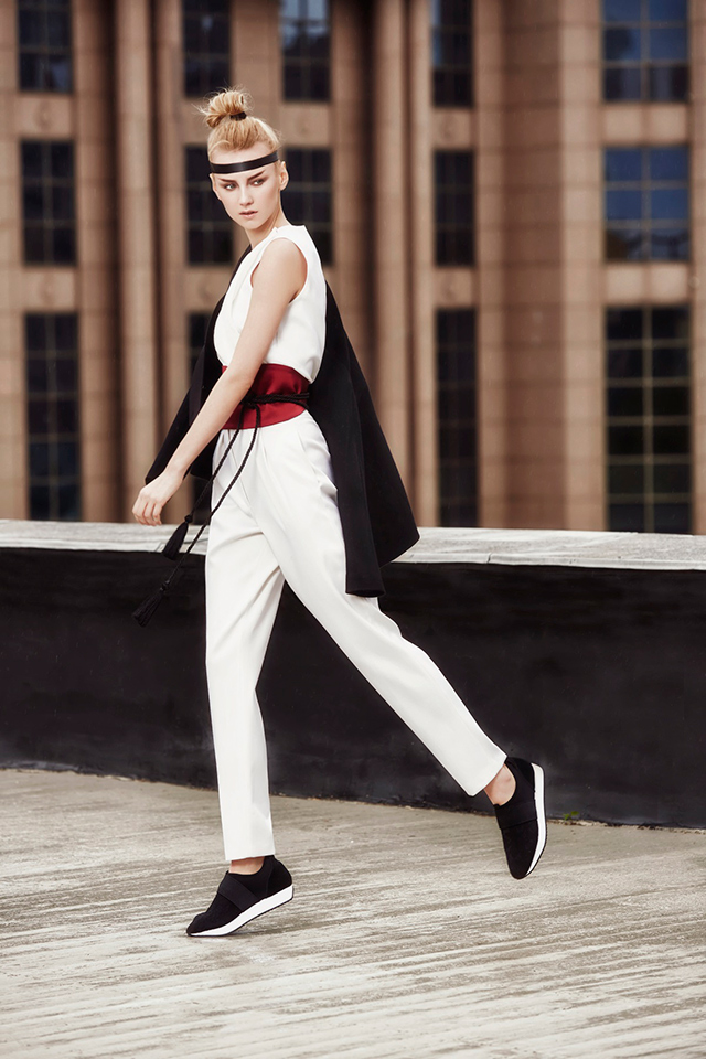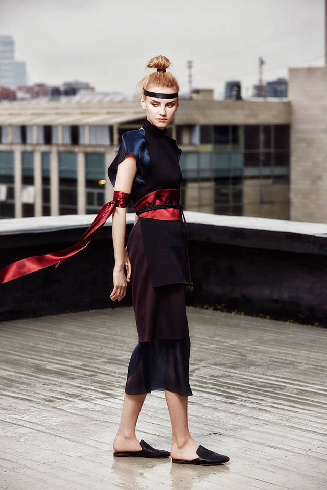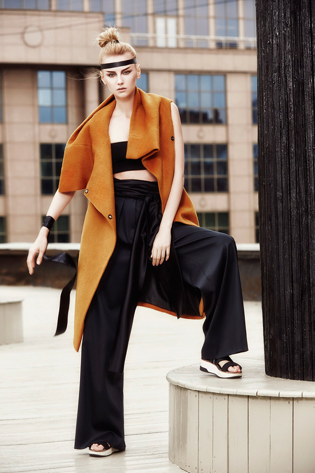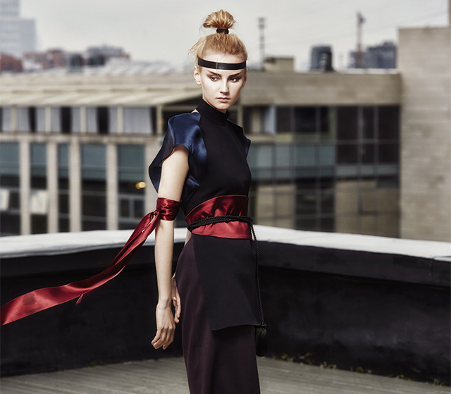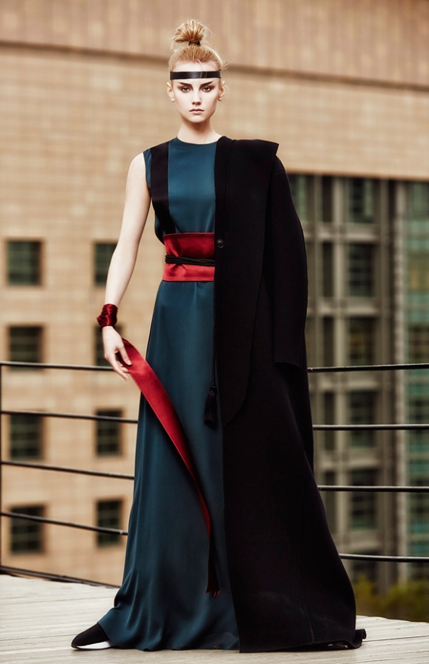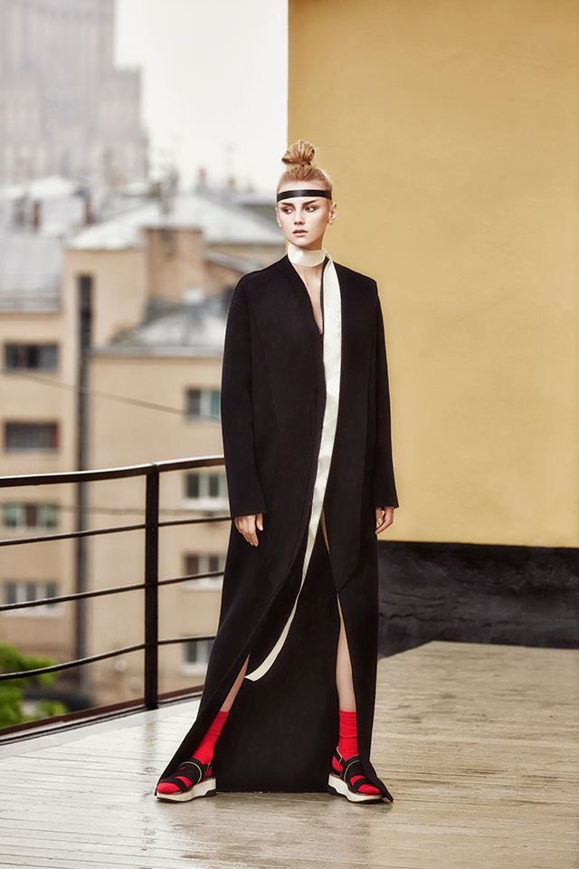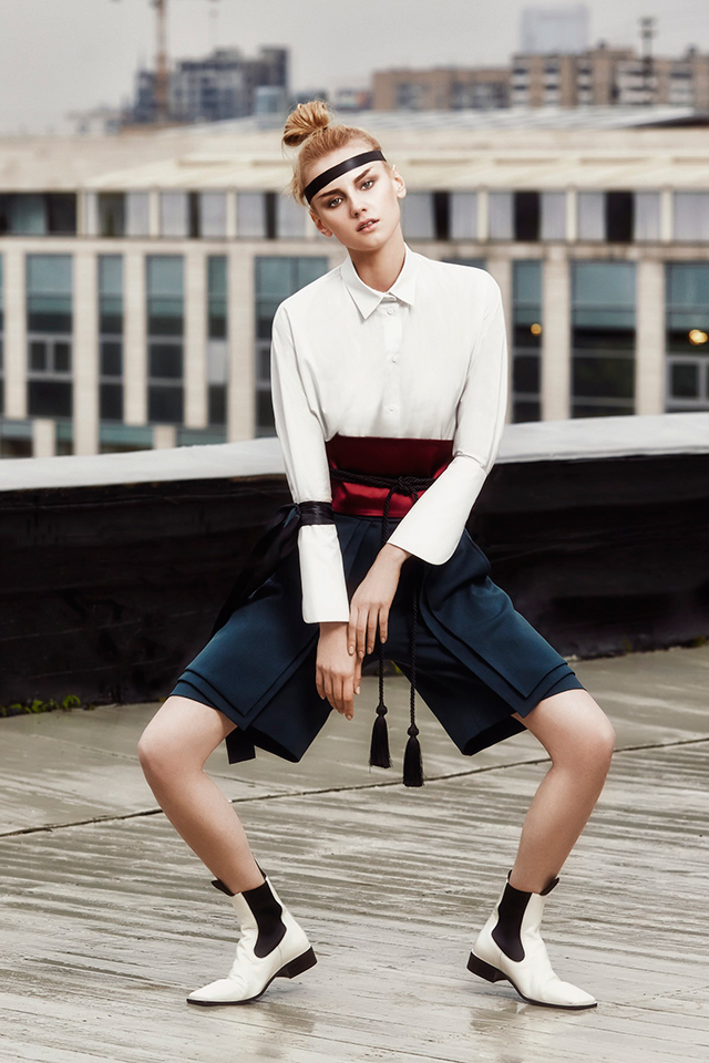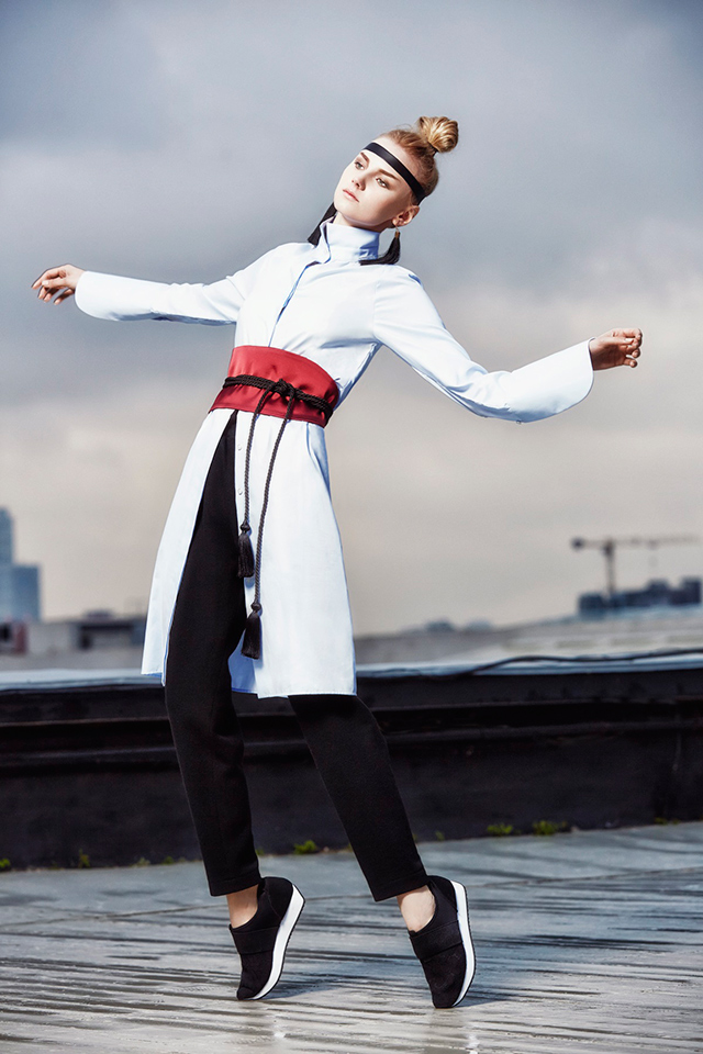 В новой коллекции Erica Zaionts — российского бренда, существующего еще с 2001 года, — азиатские мотивы становятся основными. В первую очередь интересует дизайнера и ее команду Япония (родина той самой кокэси, на самом деле небольшой расписной куклы, вырезанной из дерева, у которой нет даже рук и ног, — только тельце матрешки и голова). Напоминают о ней и повторяющиеся силуэты кимоно, утянутые широкими контрастными поясами, и воинственные самурайские наряды, и многослойные комплекты, напоминающие больше всего костюмы персонажей компьютерных игр и аниме. Главным аксессуаром коллекции в паре с обязательной лентой вокруг головы мог бы стать самурайский меч — деревянная куколка, похоже, переродилась в настоящую городскую воительницу.