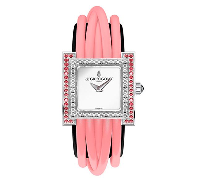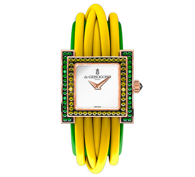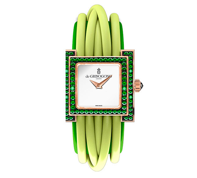 Новая коллекция часов Allegra от de Grisogono — это удивительная игра цветных нитей. Обычным этот аксессуар точно не назовешь: двойной квадратный безель, декорированный цаворитами и бриллиантами разной огранки, сложный ремешок, состоящий из неоновых кожаных шнурков, и разноцветные циферблаты просто кричат о том, что эти часы созданы удивлять. Кстати, новую модель основатель марки и главный дизайнер Фаваз Груози посвятил своей дочери, а первые украшения из этой коллекции появились аж 11 лет назад.