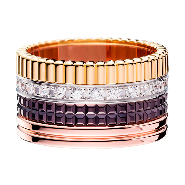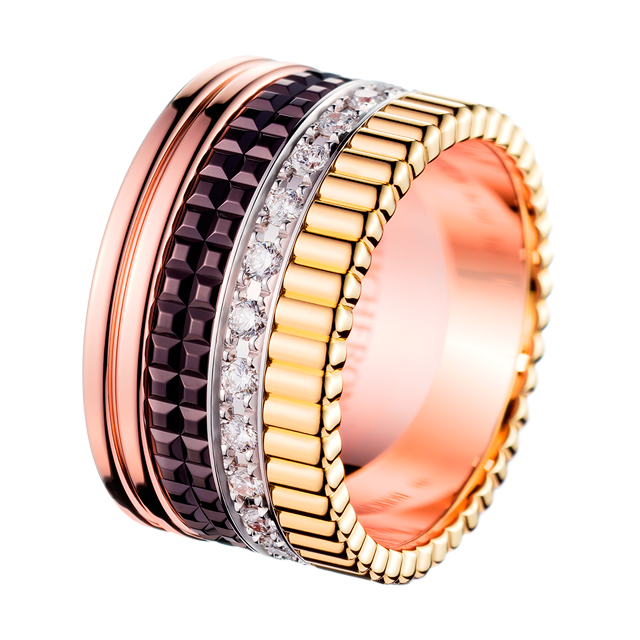 Комбинированное кольцо из коллекции Quatre от Boucheron характеризуется смелым сочетанием различных видов металла и текстур. Усыпанное бриллиантами, оно состоит также из белого, желтого и розового золота, последнее из которых в одном из "слоев" ювелирного украшения покрыто коричневой PVD-пленкой.