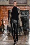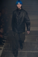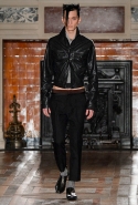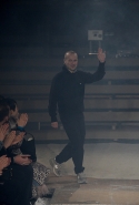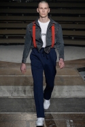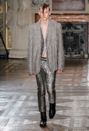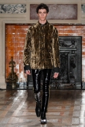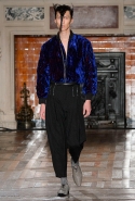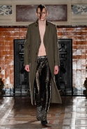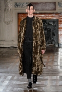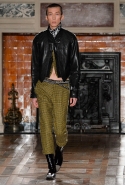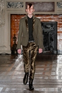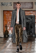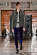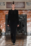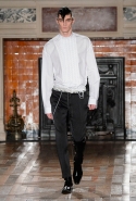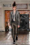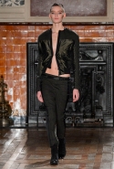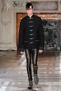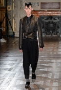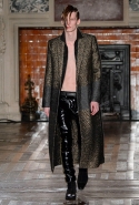 Герои коллекции Хайдера Акерманна всегда похожи на этаких денди из мира музыки — примерно так же выглядят все и на этот раз. Хотя рок-составляющая в новой осенне-зимней коллекции все же заметно опережает небрежно-стиляжную (хотя потрясающей красоты фиолетовый электрический бархат заставляет в этом засомневаться). И пусть вас не смущают ирокезы, обессиленно падающие на лица своих хозяев, вместо того чтобы бодро стоять торчком, как им и полагается, — энергии хватает и в самих вещах. Классическое сочетание очень узких брюк, обнаженного торса и надетого поверх, но так и не застегнутого пальто остается одним из основных. Как и многие музыканты, модели, изображающие их на показе, раздеваются охотно: иногда из-под плаща выглядывают еще жилетка или рубашка — тоже распахнутые, а белая полоска голого и беззащитного живота выглядывает из-под кожаной куртки. Чтобы такое происходило, дизайнер намеренно нарушает пропорции, занижая у брюк талии, укорачивая куртки и зрительно тем самым очень вытягивая торс.