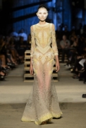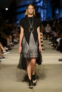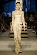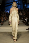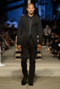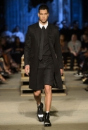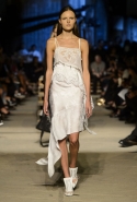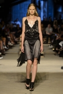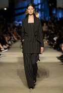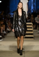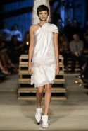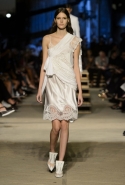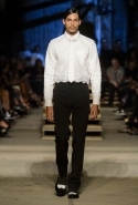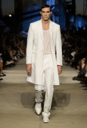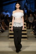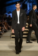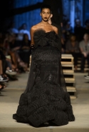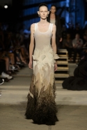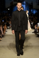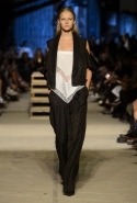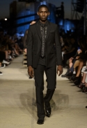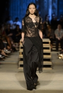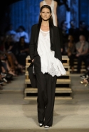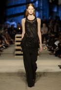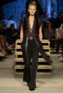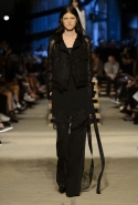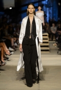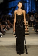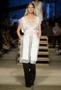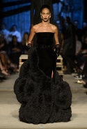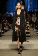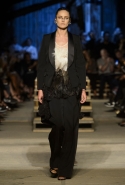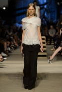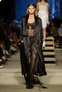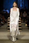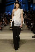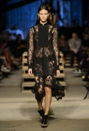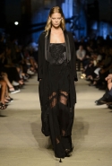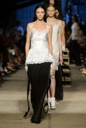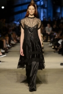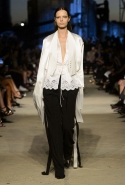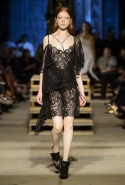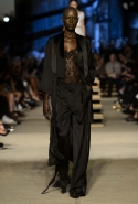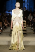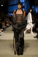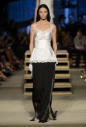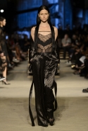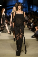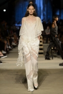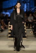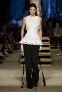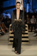 Как и в последних своих коллекциях, Тиши возвращается к основам, но не к свитшотам, треникам и другим базовым вещам, а к тому, с чего сам начинал в Givenchy в первые годы во главе модного дома. К сложным и ужасно красивым платьям с необычной, кутюрного вида отделкой, к особенным костюмам, сочетающим в себе и силу, и нежность. Широкие черные брюки в пол оказываются в паре с белыми полупрозрачными топами, собранными из слоев кружева и драпировок. За фраками идут перекроенные и усложненные платья-комбинации. Смокинги обильно украшаются перьями. Юбку вечернего черного платья в пол Тиши обшивает мехом, а широкие браслеты на руках Джоан Смоллс напоминают о том, что она далеко не беззащитная дева в беде, а и сама настоящий воин. За черным лебедем непременно идет череда белых, а где-то в середине показа одна за другой выходят девушки в красивейших кремово-белых платьях, которые раньше можно было увидеть только в кутюрных коллекциях Givenchy. Их лица покрыты золотистыми полупрозрачными лепестками, создающими совершенно неземной вид. Но после выходит череда уже вполне земных дневных красавиц. Именно на этом сочетании легкого, воздушного и трепетного с сильным, строгим, как говорят, powerful, Тиши и строит весь показ — и в этом, видимо, и заключается его понимание любви, сбивающего с ног и наполняющего энергией чувства, готового перевернуть мир.