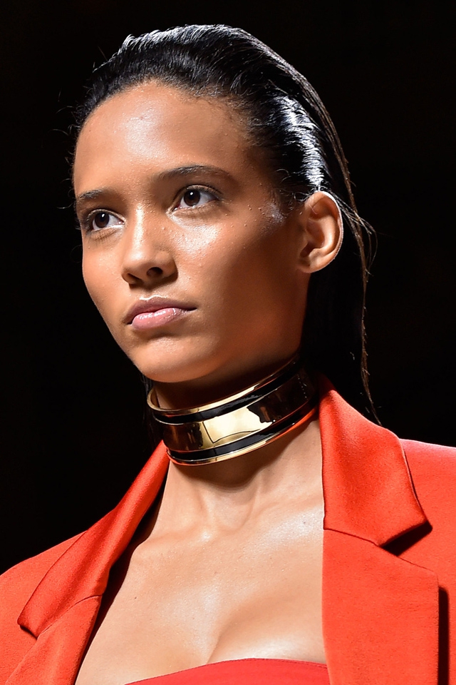 Новые трикотажные чокеры похожи сразу и на отрезанные горловины водолазок, и на сложенные вдвое спортивные повязки для волос. На осенне-зимних показах Tome, Lemaire и Ohne Titel такие носили вместе с голыми плечами и глубокими декольте, специально чтобы подчеркнуть линию плеч и выделить ключицы. Особый шик — надевать платье и чокер из одной ткани или подбирать цвет чокера к палитре всего образа. К примеру, на шоу Lemaire белые чокеры сочетались с просторной рубашкой цвета слоновой кости и бежевыми брюками-кюлотами.