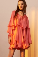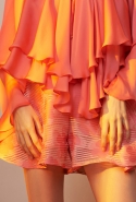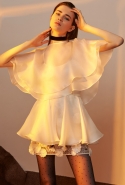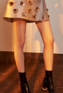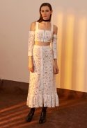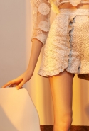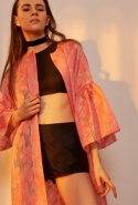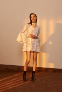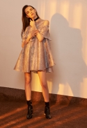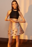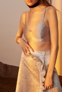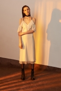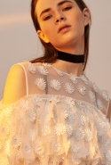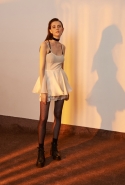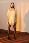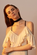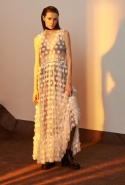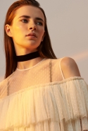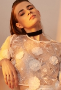 Вещи с богатой отделкой сочетаются с предметами минималистичными, а к воздушным розовым оборкам и нежным платьям Юлия Калманович добавляет и элементы гранжа, родившегося в 90-х. О нем напоминает и темное белье, просвечивающееся сквозь полупрозрачные блузы, расшитые объемными цветами, и ленты на шеях, похожие на чокеры, и черные кроп-топы, и грубоватые сапожки в сочетании с нежными вещами пудровых тонов.