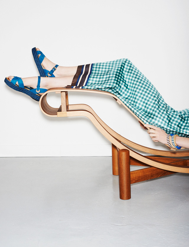Но на создание весенне-летней коллекции Louis Vuitton Icons вдохновили дизайнеров дома не только проекты Шарлотты, но и ее личность. Например, страсть Перрьян к путешествиям: поездки в Японию, во Вьетнам и даже Советский Союз. Именно в Японии она полюбила использовать как материал дерево вместо стекла и пластика — и отсюда в Icons пришли деревянные подошвы и платформы всей обуви.