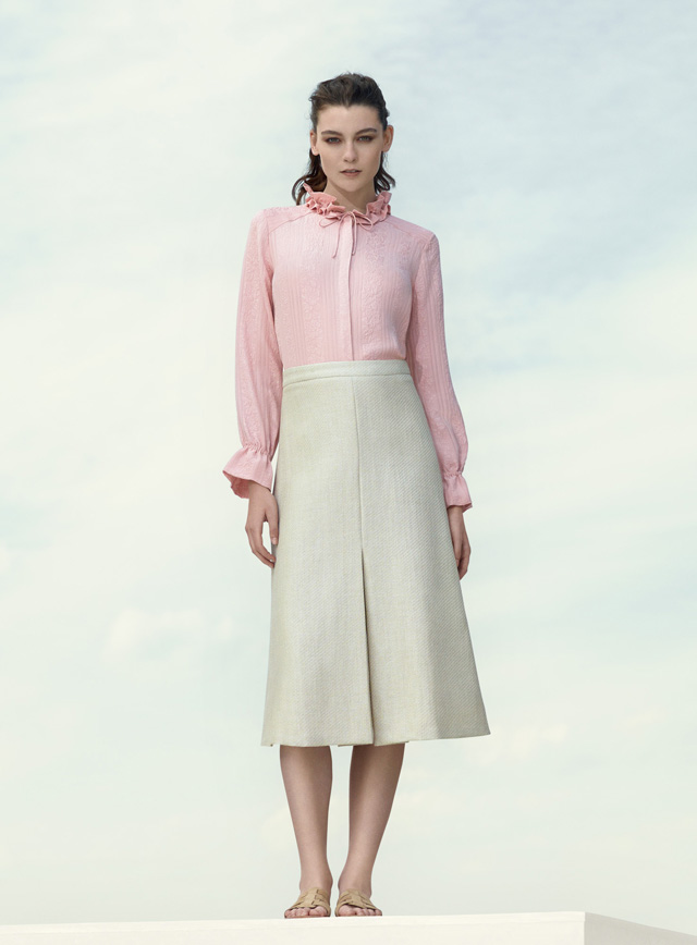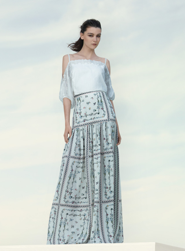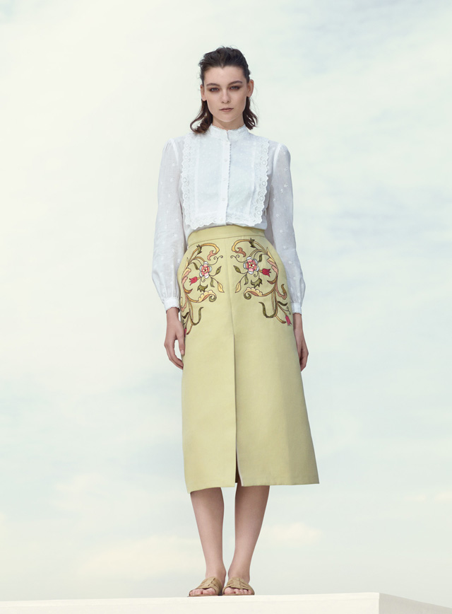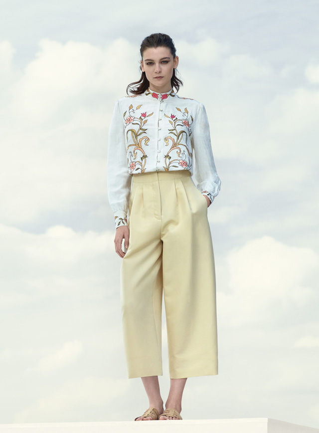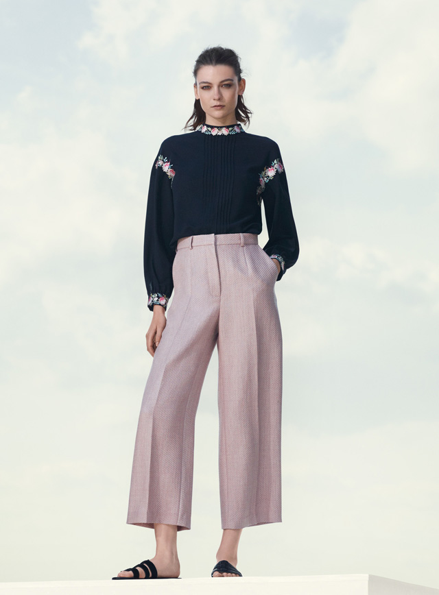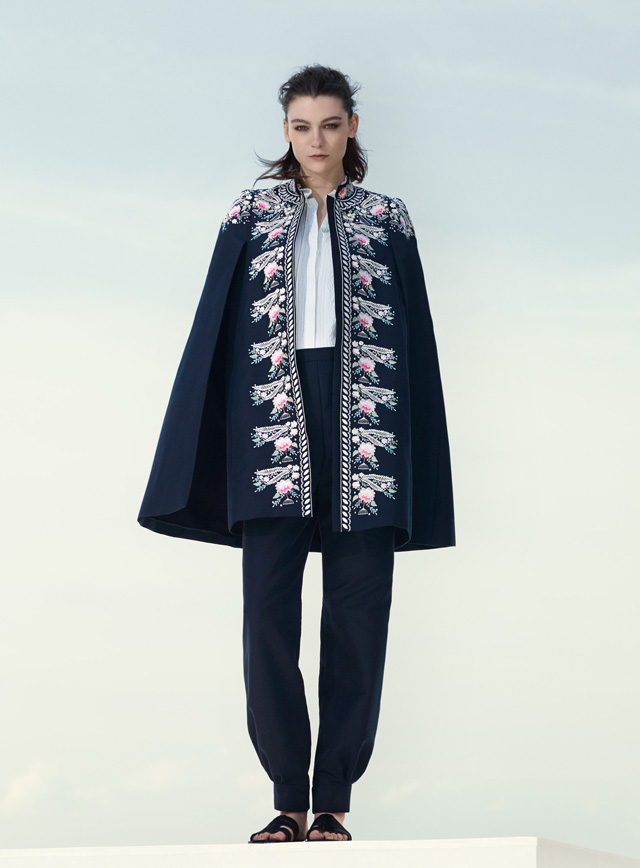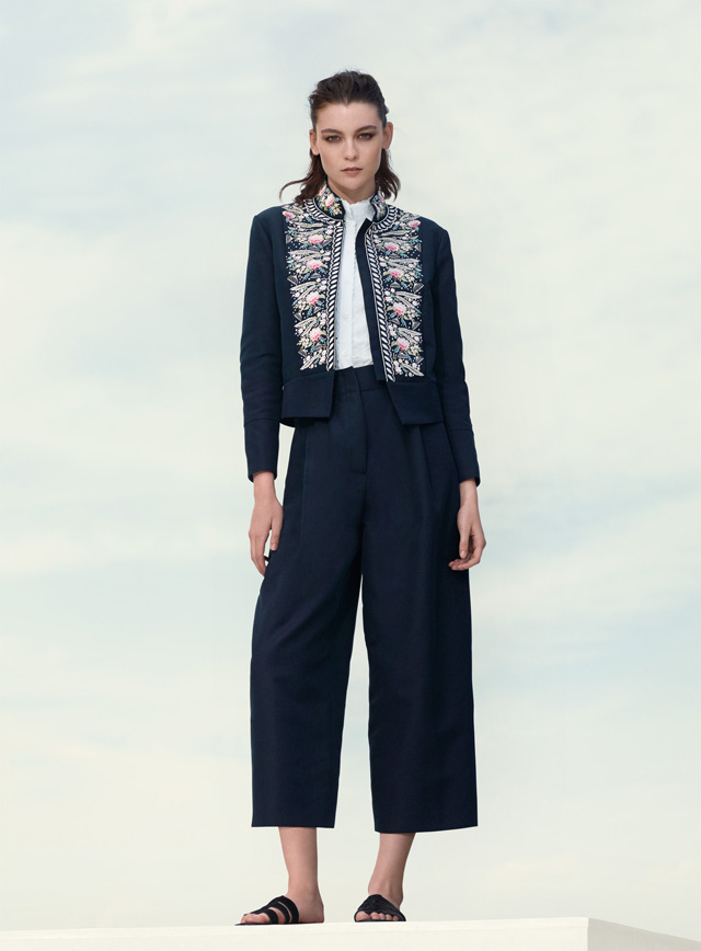 Поэтому главным образом связь с историей супруги Людовика XVI прослеживается в выборе цветовой гаммы. Вместо традиционных для марки темных тонов, от бордового до болотного, на которых сложные цветочные вышивки выглядят особенно красиво, в компании с белым на этот раз идут только пастельные тона. Светло-розовый, нежно-зеленый, лимонный и голубой — все оттенки из коробки с macarons в одной коллекции. Черный и темно-синий тоже появляются, но совсем ненадолго: в этих цветах выполнены только пара костюмов (едва ли не самых красивых из всей коллекции) и одна блуза с цветочными лентами, пущенными по всем швам.