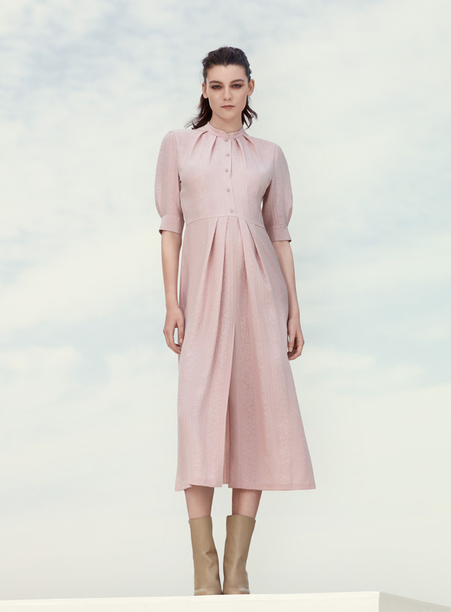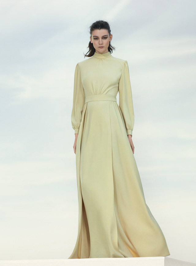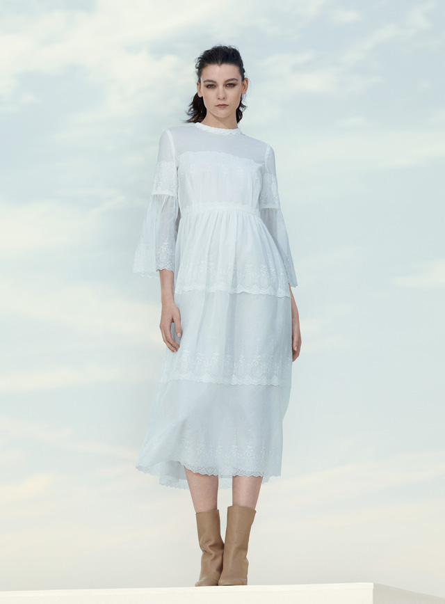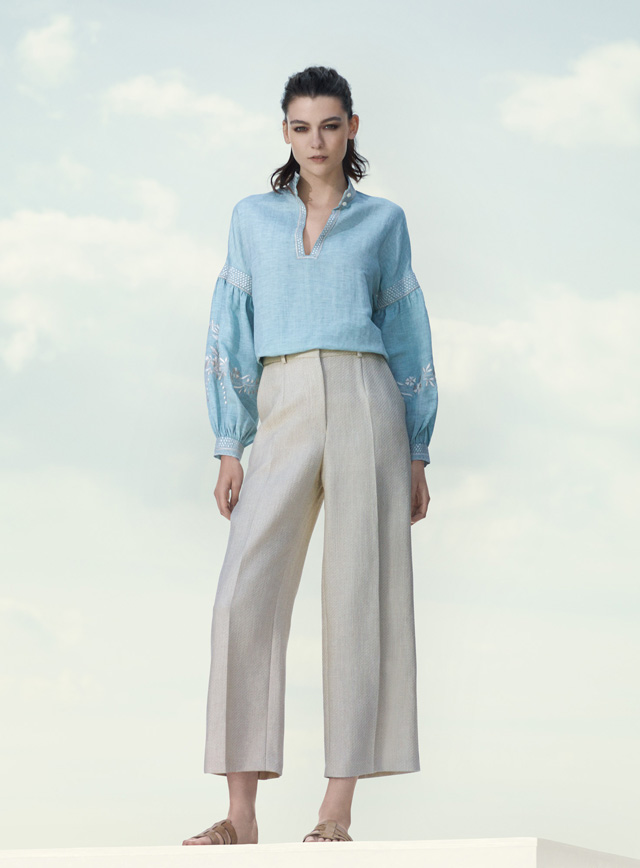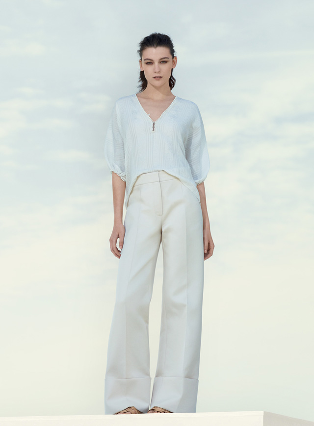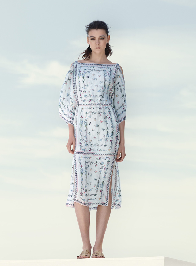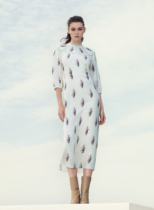 Поэтому главным образом связь с историей супруги Людовика XVI прослеживается в выборе цветовой гаммы. Вместо традиционных для марки темных тонов, от бордового до болотного, на которых сложные цветочные вышивки выглядят особенно красиво, в компании с белым на этот раз идут только пастельные тона. Светло-розовый, нежно-зеленый, лимонный и голубой — все оттенки из коробки с macarons в одной коллекции. Черный и темно-синий тоже появляются, но совсем ненадолго: в этих цветах выполнены только пара костюмов (едва ли не самых красивых из всей коллекции) и одна блуза с цветочными лентами, пущенными по всем швам.