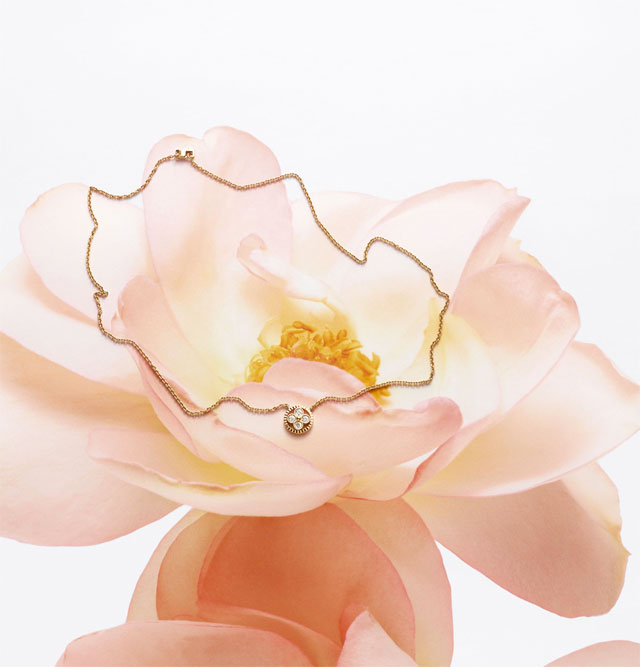 А вот цветок Monogram в центре часов Blossom — настоящий шедевр коллекции. Он вырезан из цельного куска перламутра в технике, чаще используемой для резки камней. Благодаря ей очертания и оттенки цветка переливаются и плавно перетекают друг в друга с каждым движением руки. Оборотная сторона часов вручную расписана синим или розовым цветом. Помимо перламутрового цветка каждый циферблат украшен бриллиантами. Так, часы с циферблатом из розового золота инкрустированы в технике snow-setting, создающей эффект снежной россыпи.