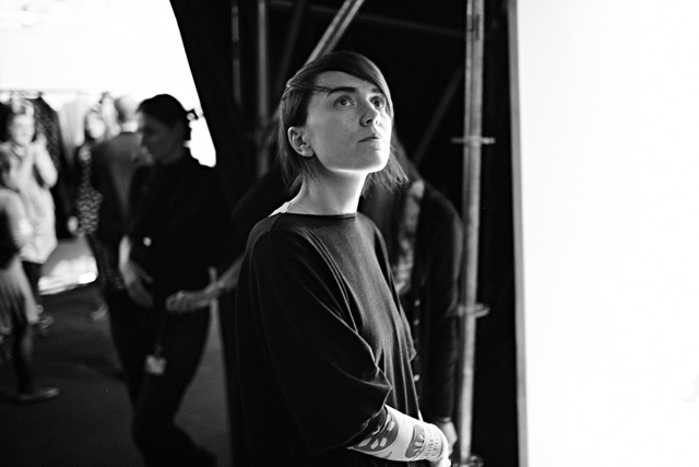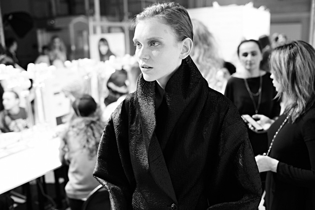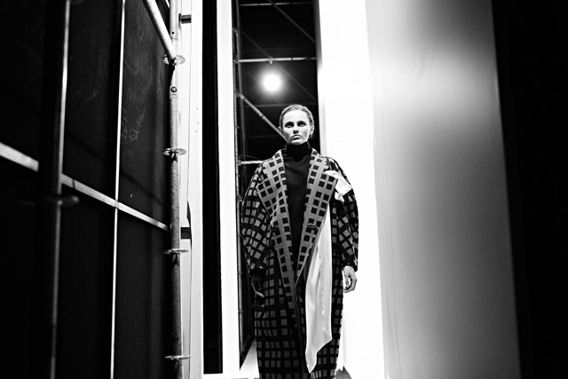 Объемные графичные пальто Litkovskaya на черно-белых снимках Ивана Кайдаша смотрятся ничуть не менее внушительно, чем в цвете, — и становятся еще больше похожи на архитектурные сооружения, конструктивистские дома, вычерченные резкими прямыми линиями. Крупная клетка, напоминающая решетки окон, жидким блеском сияющие в лучах софитов ткани, платья в разрезах — геометрические конструкции встречаются с деконструкцией, резкий черный — с рассеянным светом.