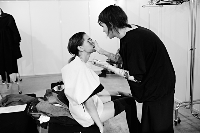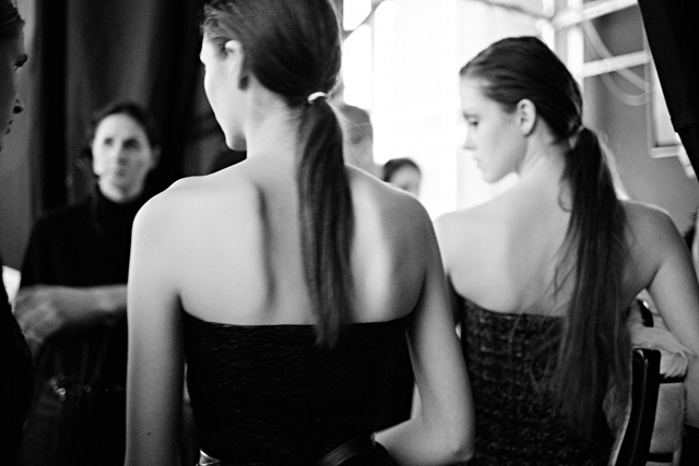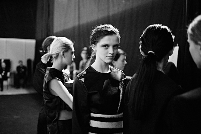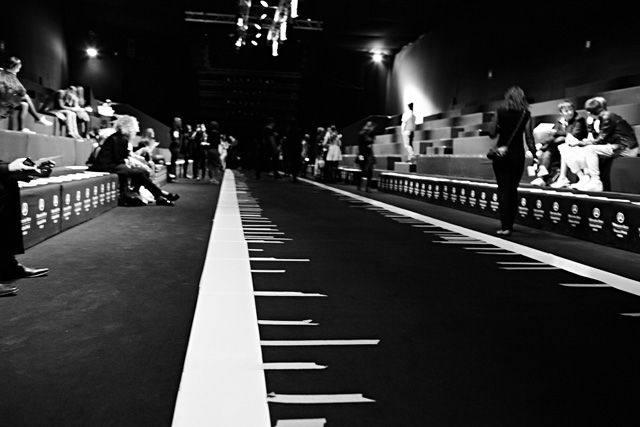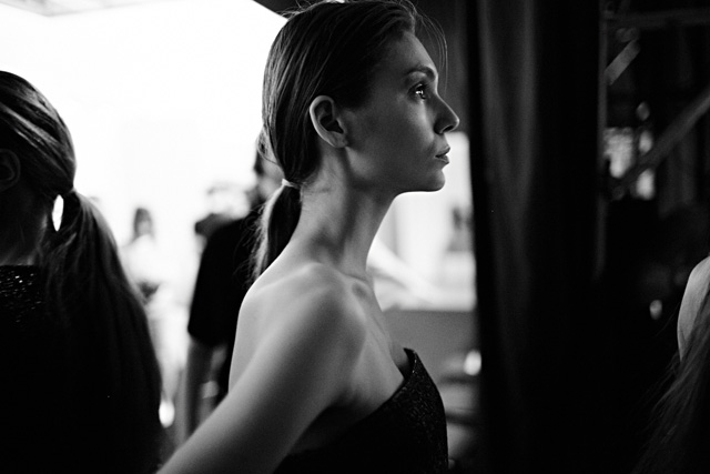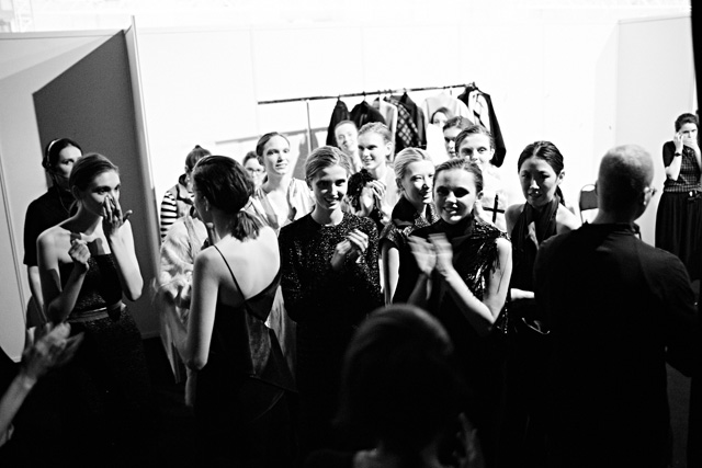 Модели выстраиваются в ряд перед выходом в зал, нервно оглядываясь на экран, на котором уже вышагивают перед зрителями их подруги, еще секунду назад с тем же волнением готовившиеся ступить на подиум. Раз, два, три — кажется, шоу только успело начаться, но вот на поклон уже выходит сама Лилия Литковская, и полный зал встречает ее аплодисментами.