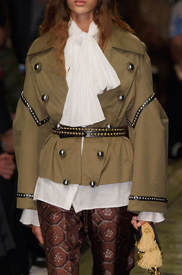 Литературные аллюзии вылились в исторически насыщенную коллекцию, которая, как и книга, охватила несколько веков костюма. Мы увидели Средневековье (ставшее очевидным трендом нового сезона) в виде воротников-стоек и мужских бантов, камзолы, пижамные костюмы, богато украшенные мундиры и, конечно, фирменные пальто-тренчи.