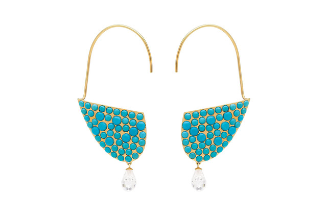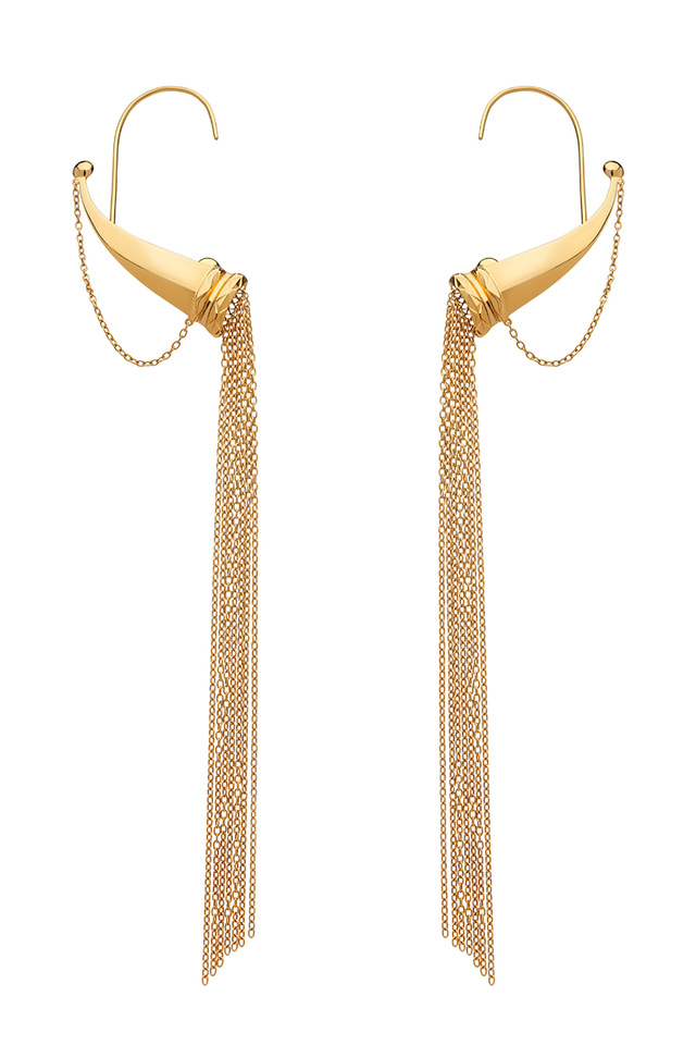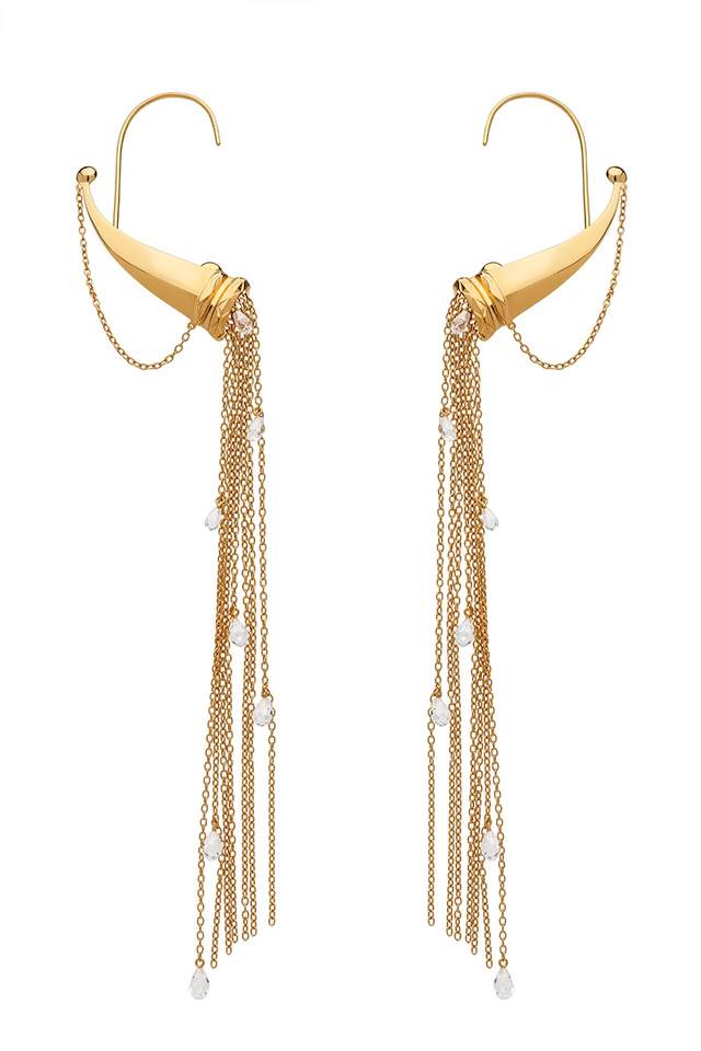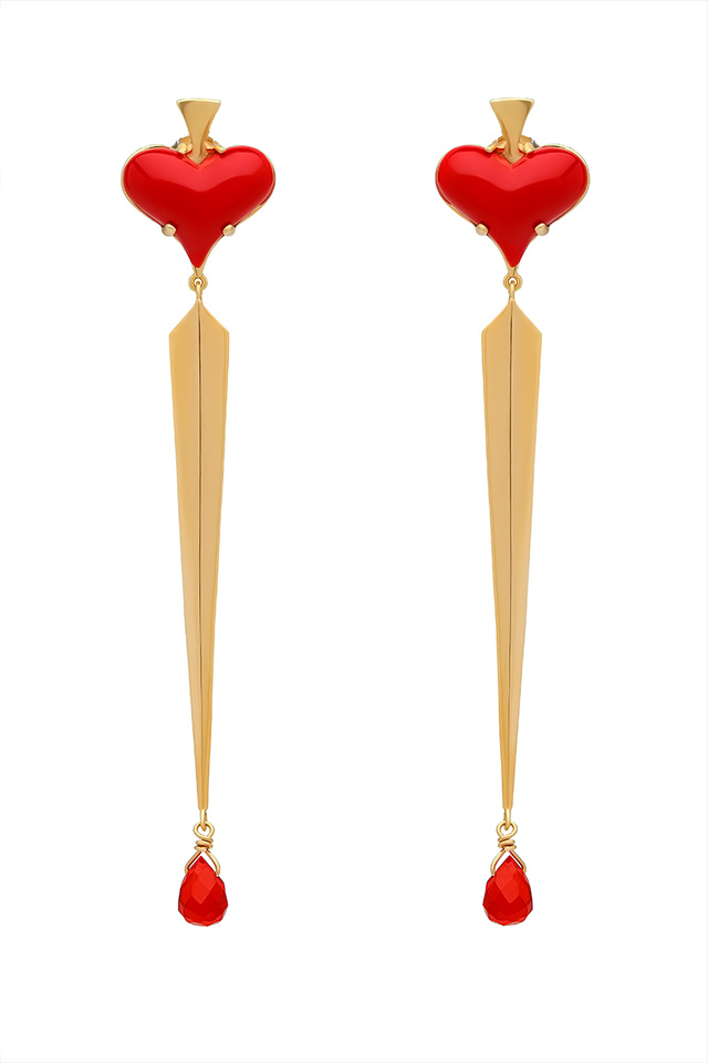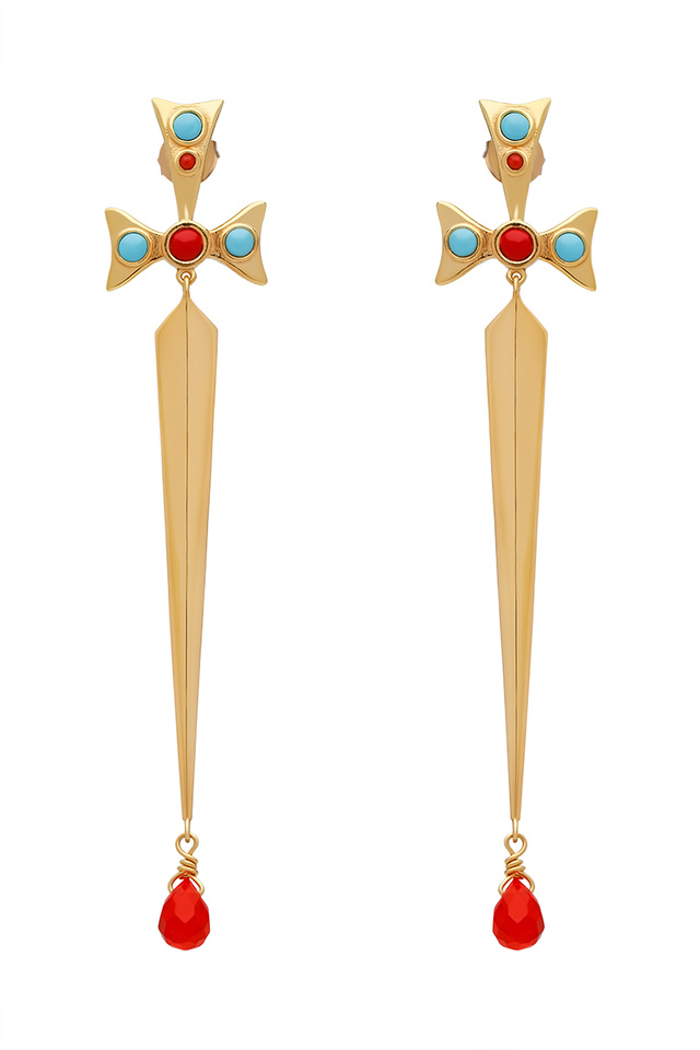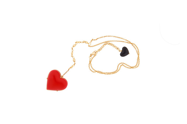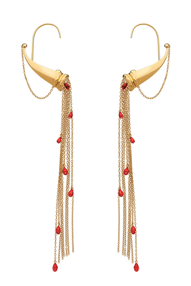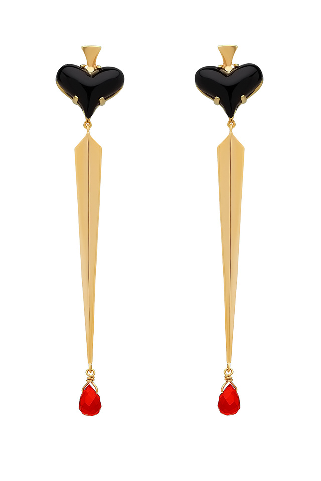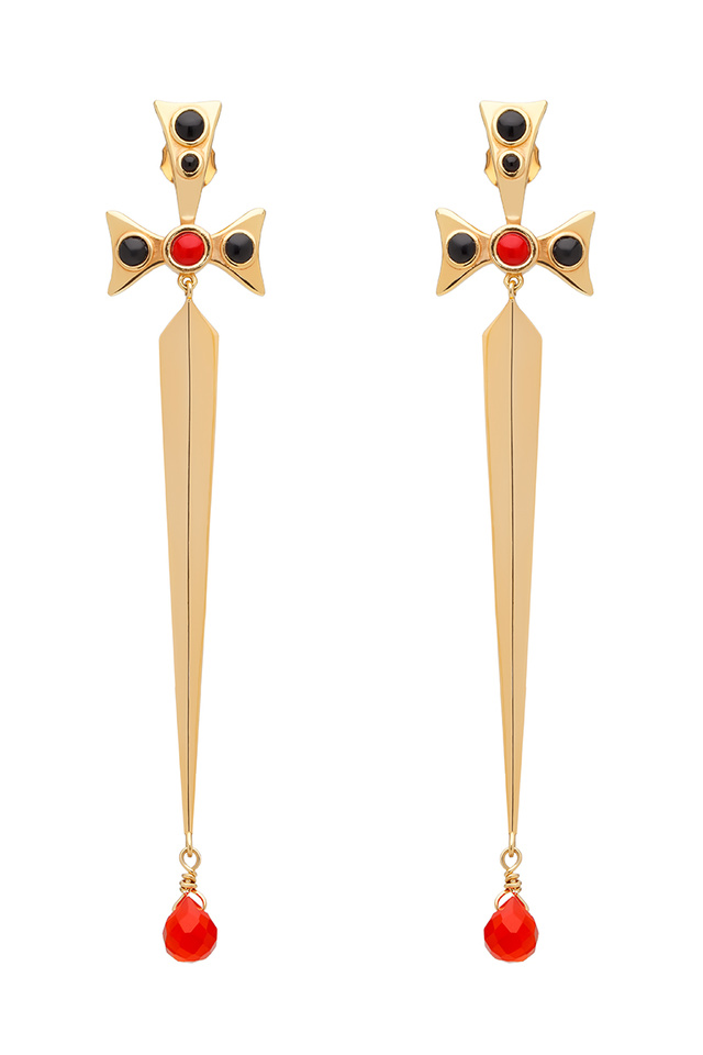 Свою весеннюю кутюрную коллекцию Ульяна Сергеенко, как вы наверняка помните, посвятила Грузии и Армении, откуда родом ее муж. В венах жителей этих краев течет самая горячая кровь, поэтому не обошлось без сбивающих с ног страстей даже в коллекции аксессуаров. Серьги собраны из сердец и заточенных (не переживайте, это только фигура речи: вряд ли эти красивые сережки могут быть опасны для своей счастливой хозяйки) клинков, а главными цветами всех украшений, будь то подвески или сумки, стали черный и красный.