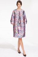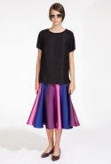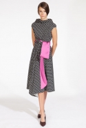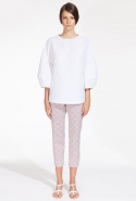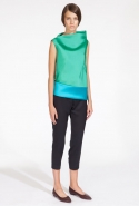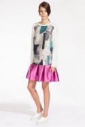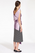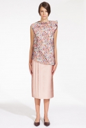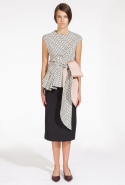 Без симпатичных простых блуз со свободными рукавами, скромных брюк в крапинку и, допустим, в меру летящих юбок, дело тоже не обошлось. Но из центра внимания их совершенно вытесняют вещи более карнавальные и яркие. Например, трехцветная юбка, собранная из блоков розового, синего и фиолетового. Или крапчатое платье, разрезанное прямо посередине ярким розовым поясом, оттенок которого на этом фоне почти режет глаз. И, конечно, топы с объемными воротниками, а иногда и замысловатыми плетениями на спинах — они, бесспорно, очень красивы, но точно не повседневны.