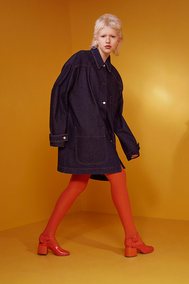 А вот вторая часть коллекции получилась вполне земной. В нее вошли джинсовые юбки, минималистичные платья с треугольными глубокими вырезами (носить с высокими перчатками и не переживать из-за того, что это может быть слишком «вечерним», — даже если и так, какая разница?), брючные огромные костюмы и массивные куртки.