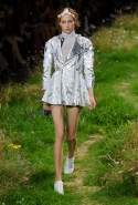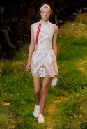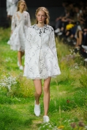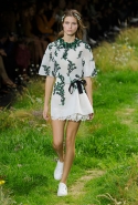 Интегрировать спорт в эту нежную и «девочковую» коллекцию у Валли вышло достаточно убедительно: даже кроссовки, которые по-прежнему с короткими и пышными платьицами выглядят иногда спорно, здесь не смущали. Также отлично выглядели и бомберы, худи, куртки и даже целиковые серые тренировочные костюмы, любовно украшенные объемными вышивками с теми же маргаритками и ландышами. Но лучше всего оказались платья baby doll, при создании которых Валли использовал только некоторые элементы вещей традиционно спортивных. Например, врезал в белое кружево контрастные красные молнии или полосы другого материала, заставив платье стать похожим на неожиданный элемент олимпийской формы. А вот красные шорты с полосками по бокам, надетые поверх белого кружевного боди-чулка, выглядели уже чересчур странно — такой наряд, впрочем, и без шорт смотрелся бы сомнительно.