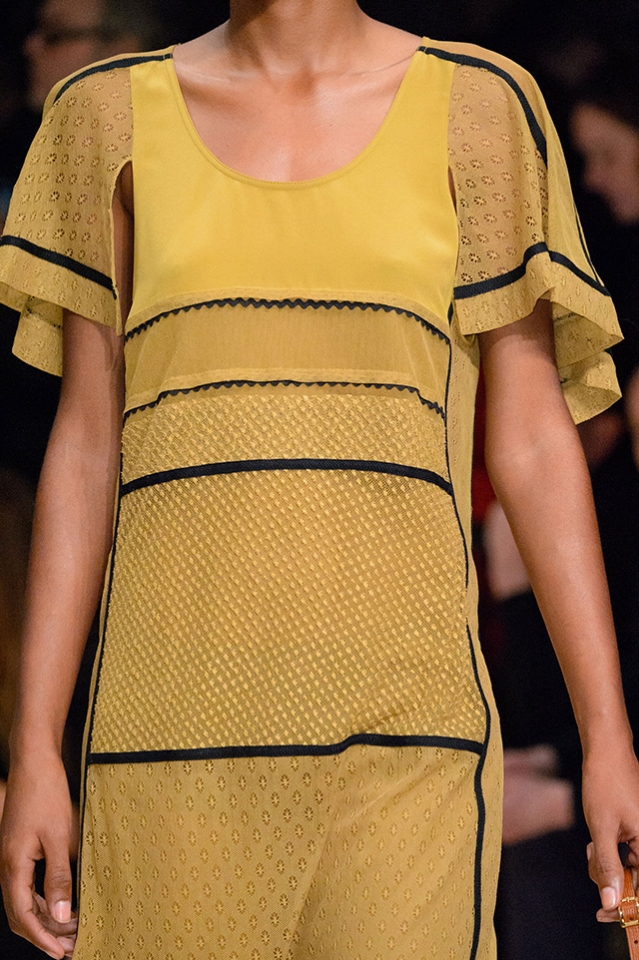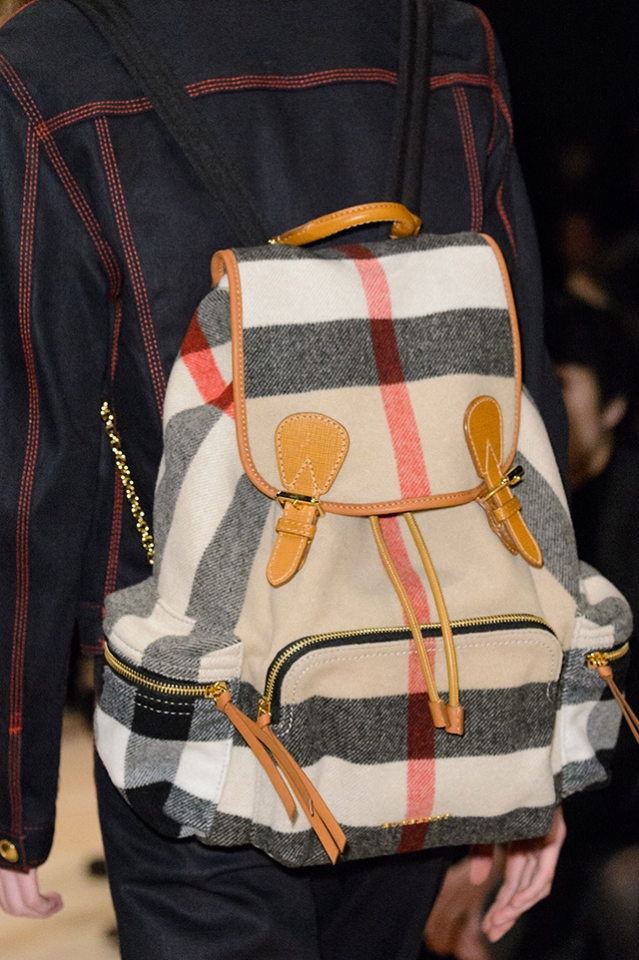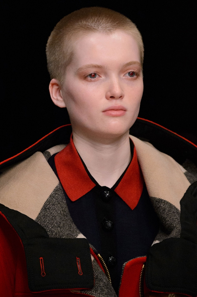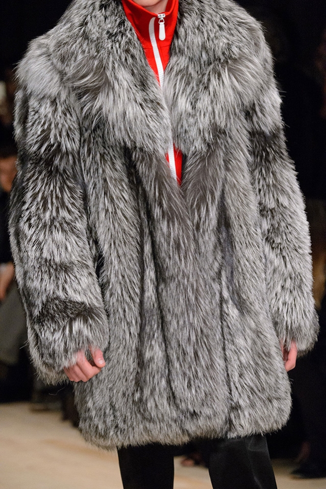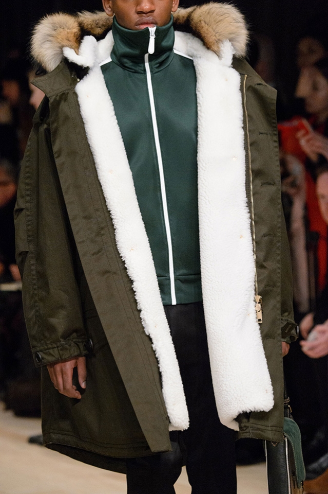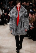 После того как замечаешь пайетки, по-новому начинаешь смотреть и на другие вещи, до этого остававшиеся без внимания. Например, шубы с узором в виде увеличенной в размере и изменившейся в цветах традиционной клетки Burberry. Или другие шубы, собранные из разного меха и с какими-то куцыми рукавами на резинках. В такие моменты даже невольно вспоминаешь Гошу Рубчинского с его совсем не традиционной эстетикой.