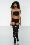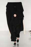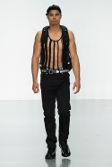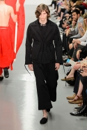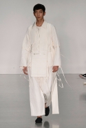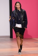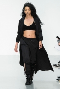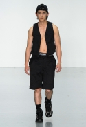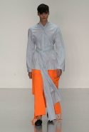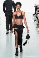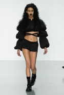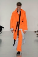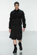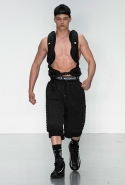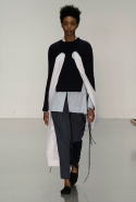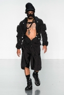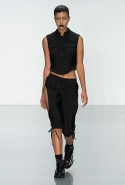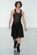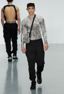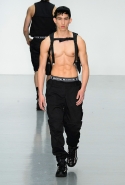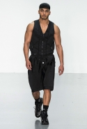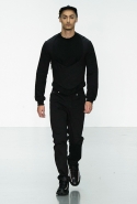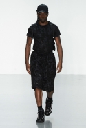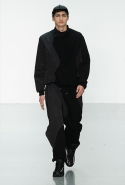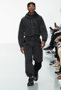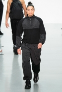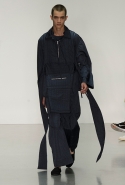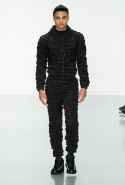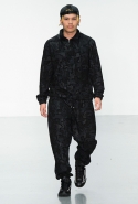 Главное слово в новой коллекции Nasir Mazhar — это по-прежнему «спорт». Для того чтобы быть в своей давно и навеки избранной теме убедительным, дизайнеру достаточно всего двух цветов: черного и серого — разбавляют их только мелкий принт, похожий издалека на имитацию змеиной кожи, и непременные надписи с логотипом марки. Неожиданностью становится появление здесь совсем неспортивных элементов. Мажар разбавляет свои глухие расхлябанные комбинезоны, вечные треники и ремни-перетяжки деталями, пришедшими из гардероба дам прошлых столетий. Неожиданно рукава и перед очередного черного худи собираются мелкими складками, обретая дополнительный объем, а на темном свитшоте обнаруживается жилет, по крою напоминающий дамский корсет — с кроссовками это сочетание, кстати, смотрится просто отлично.