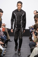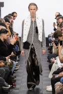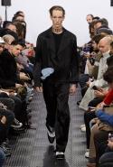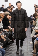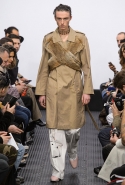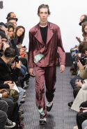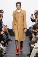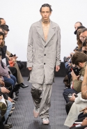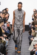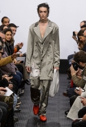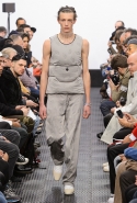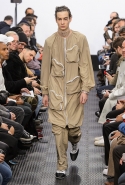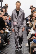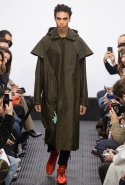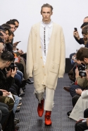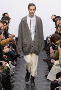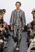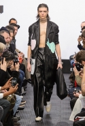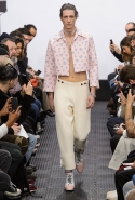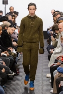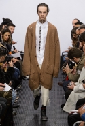 Хотя в последние несколько сезонов британский дизайнер все-таки отошел от этой традиции, раньше его мужские и женские коллекции были связаны так плотно, как это только возможно. Повторяющиеся мотивы перетекали из одной истории в другую, а крой и силуэты, исторически «соответствующие» какому-то из полов, обязательно оказывались на территории противоположного. О том, что связи эти ослабли, и обе линии обрели со временем куда большую независимость, мы уже говорили, называя это признаком взросления Андерсона как дизайнера — теперь он разрабатывает другие приемы, что, конечно, многообещающе. Но сейчас все вернулось к истокам: между сегодняшним мужским показом и женской коллекцией pre-fall 2016 того же Джонатана Андерсона связь не заметить невозможно. Сначала вспоминаются пухлые тканевые облака, которые мы видели на топах и комбинезонах в декабрьском лукбуке, а при ближайшем рассмотрении оказывается, что некоторые образы скопированы до мельчайших деталей. Например, вязаный оливковый костюм с перевязанными тесьмой на запястьях рукавами. Или серебристый комбинезон с огромными квадратами карманов на мешковатых брюках, нашитыми на грудь облачком и воротником на резинке.