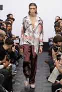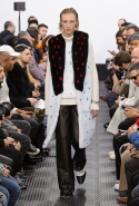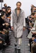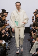 Но женская межсезонная коллекция была не такой объемной: к тому же ключевой темой, объединяющей эти 19 выходов, стали гипертрофированные объемы. В мужских же 30 с лишним все по-другому — хотя и нетрадиционно (пусть в 2016 году это слово и потеряло окончательно свою актуальность), объемных вещей здесь тоже достаточно. И все-таки основной линией, связывающей все образы, становится инфантильность, почти диснеевский подход к одеванию всех главных и второстепенных персонажей, оказывающихся в этот день на подиуме. Начинается все с пастельных — мятных и розовых — улиток, неспешно ползущих по курткам и меховым белым шубкам, продолжается мультипликационными, но жутковатыми зверушками и принтом из водяных пистолетов, а заканчивается как раз безобиднейшими облаками.